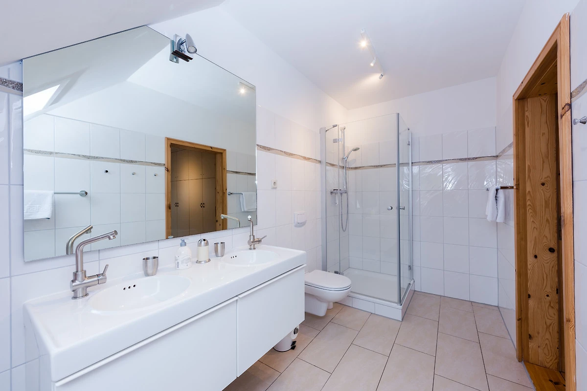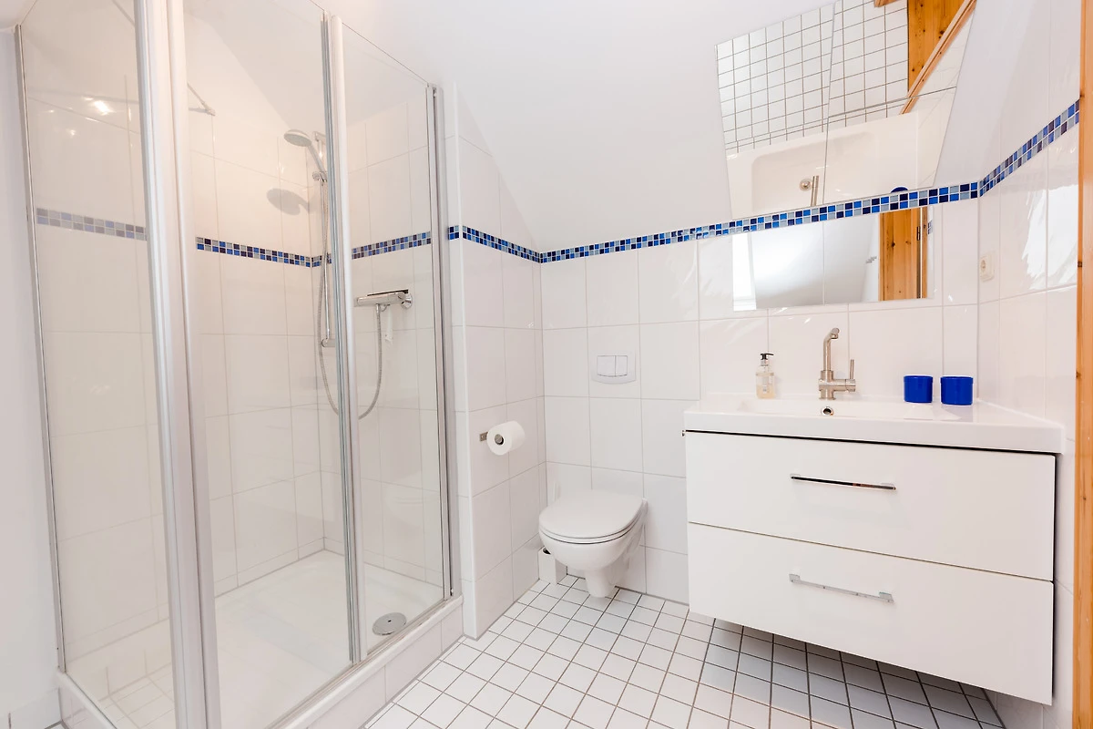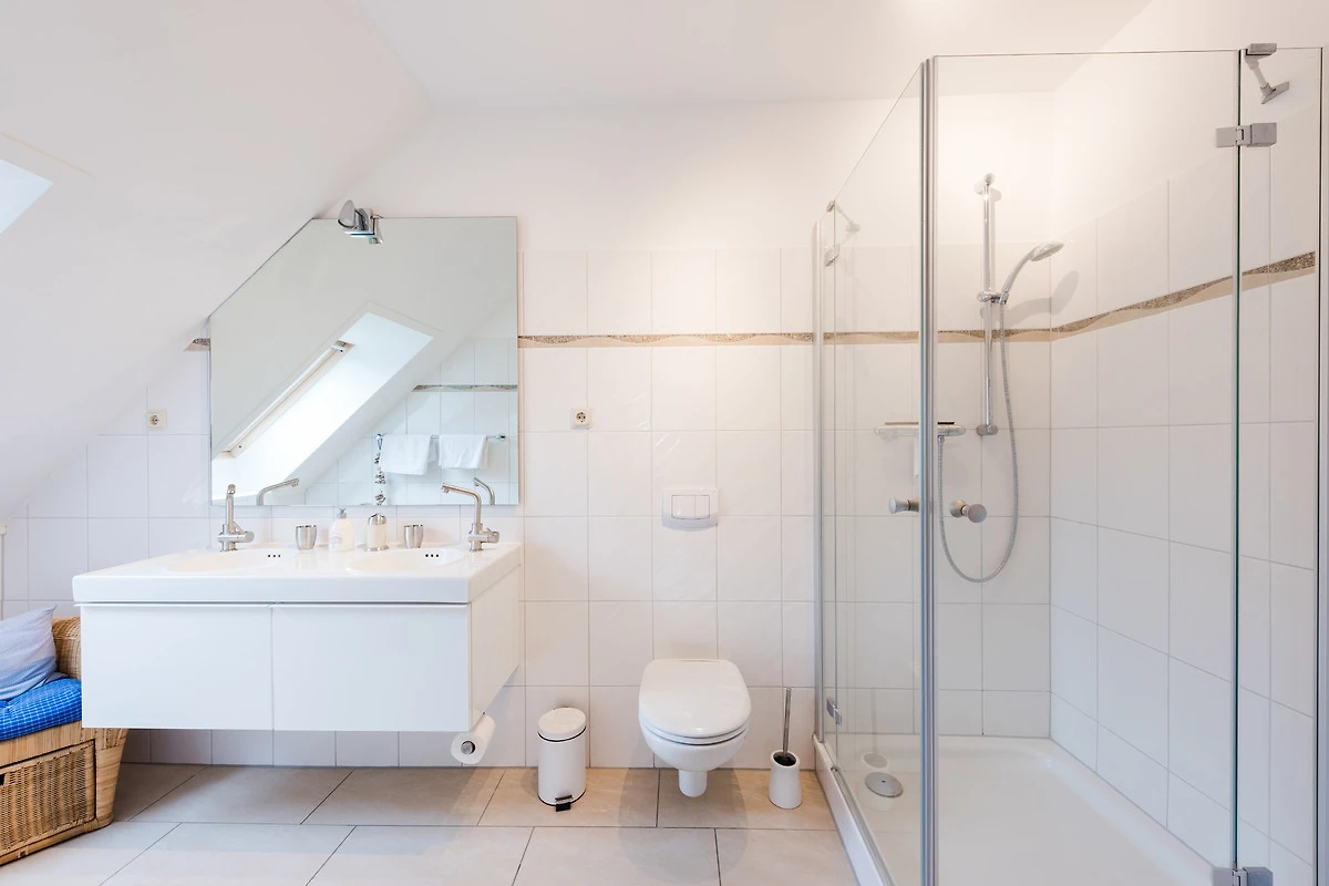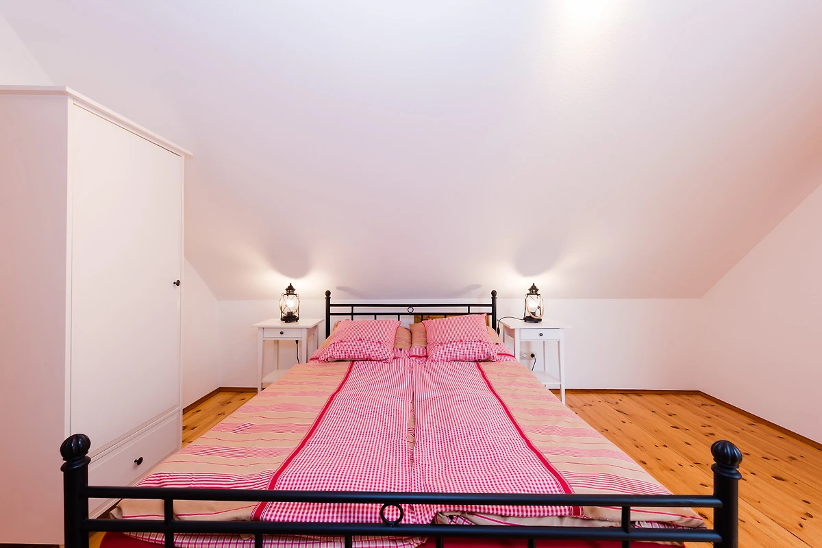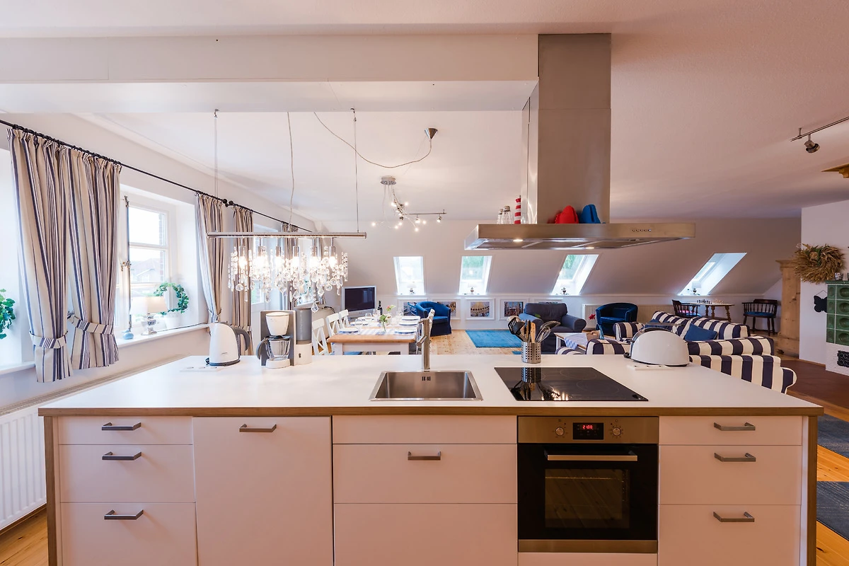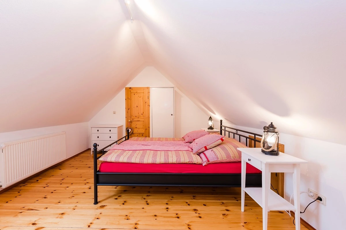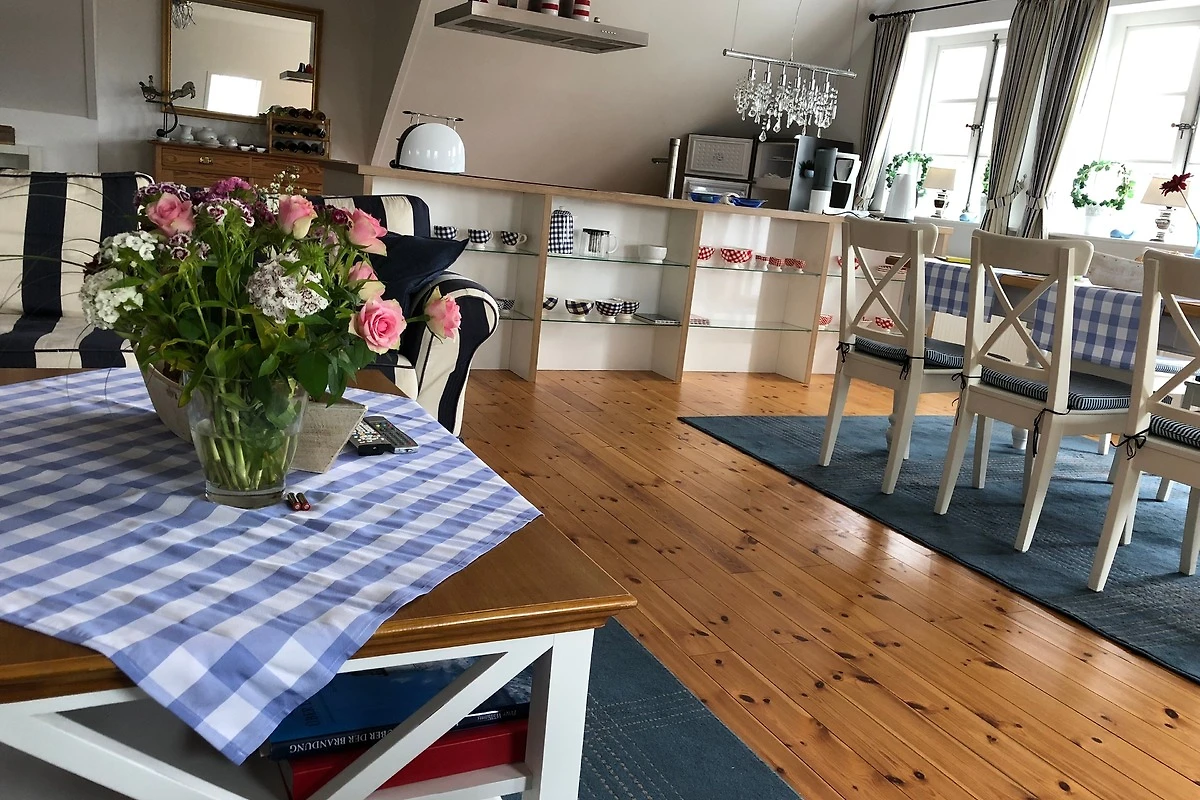 Die untere Etage (ca. 120 qm). umfasst grosszügige Diele, Bad, Schlafzimmer und grossen Wohnbereich. Die zweite Ebene der Wohnung im Dachgeschoss bietet einen zusätzlichem Wohnraum (mit Schlafcouch), ein zweites Schlafzimmer und ein weiteres Duschbad.