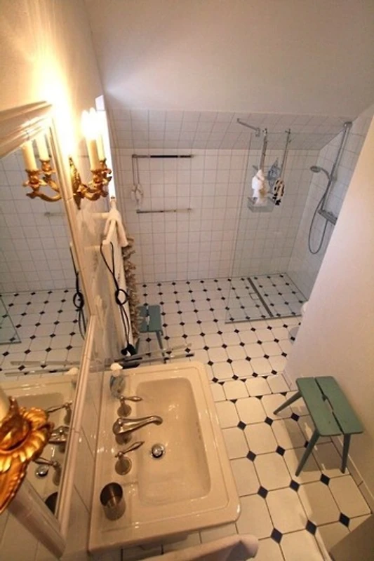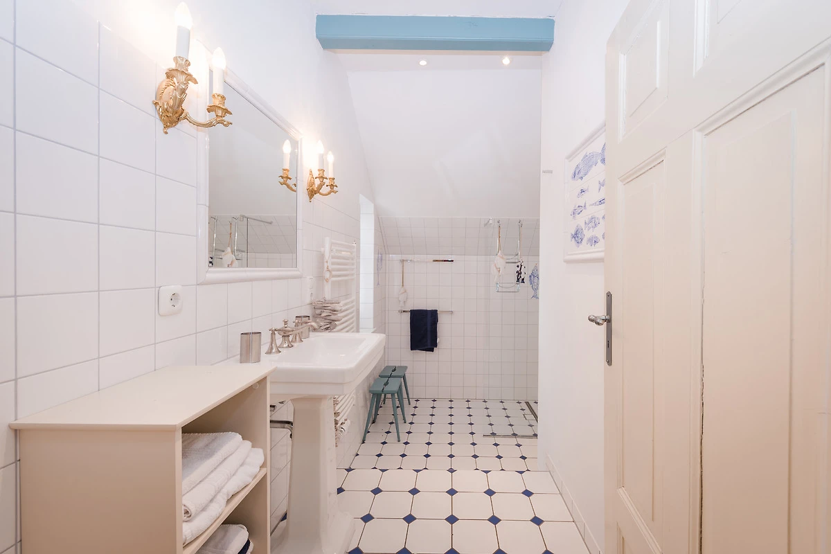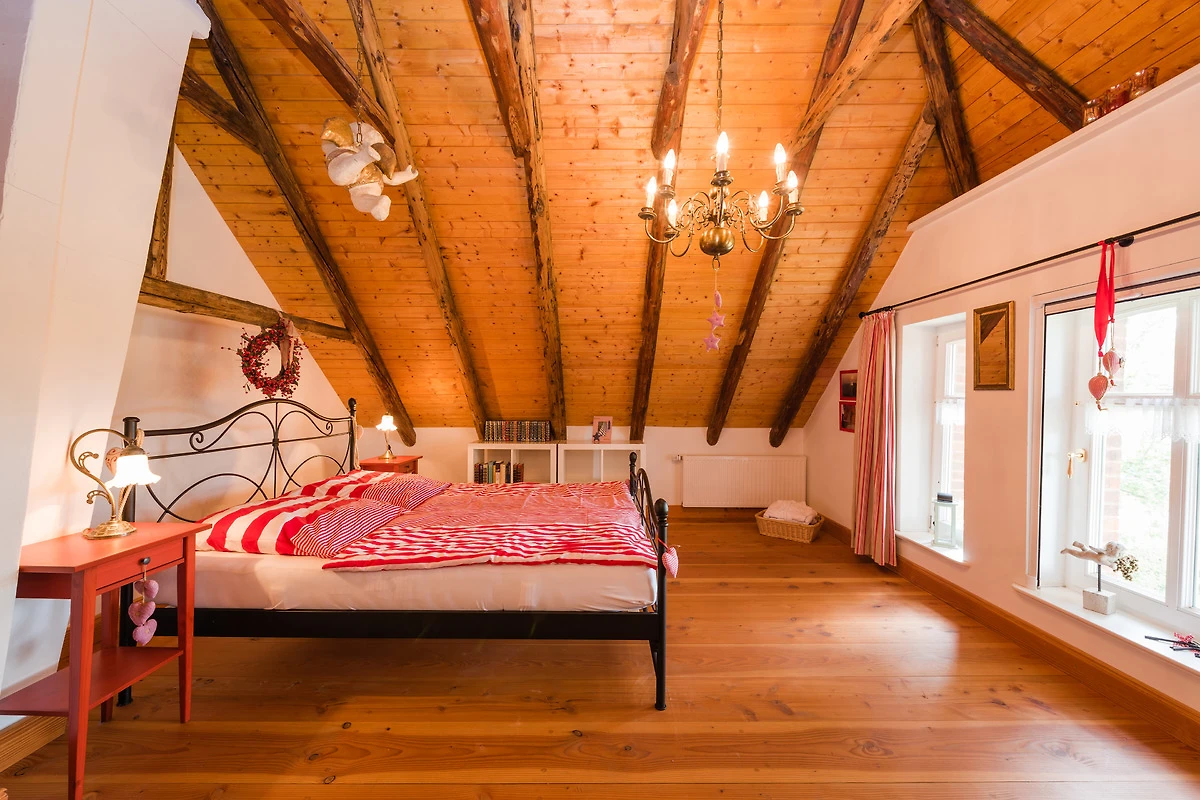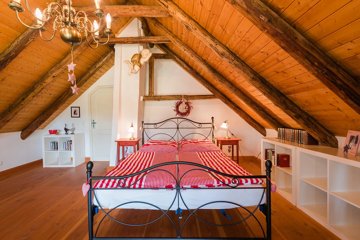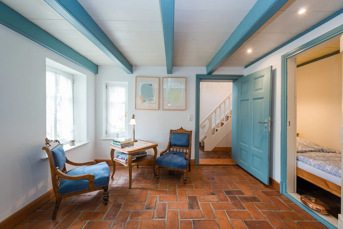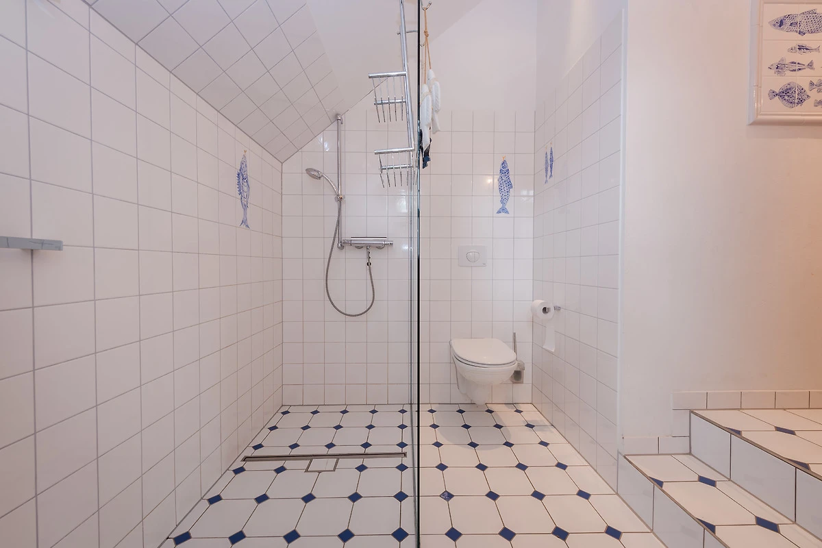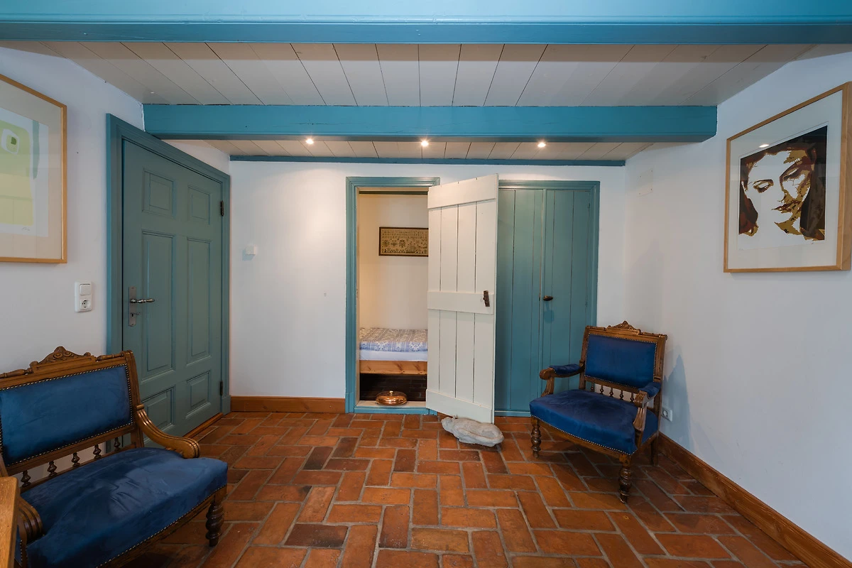 Das Butzenbett-Zimmer befindet sich ebenfalls im Erdgeschoss. Auch das geräumige Badezimmer - natürlich mit Fussbodenheizung - und: handgemalten Fliesen. Ein traumhaftes Schlafzimmer gibt es im Dachgeschoss.