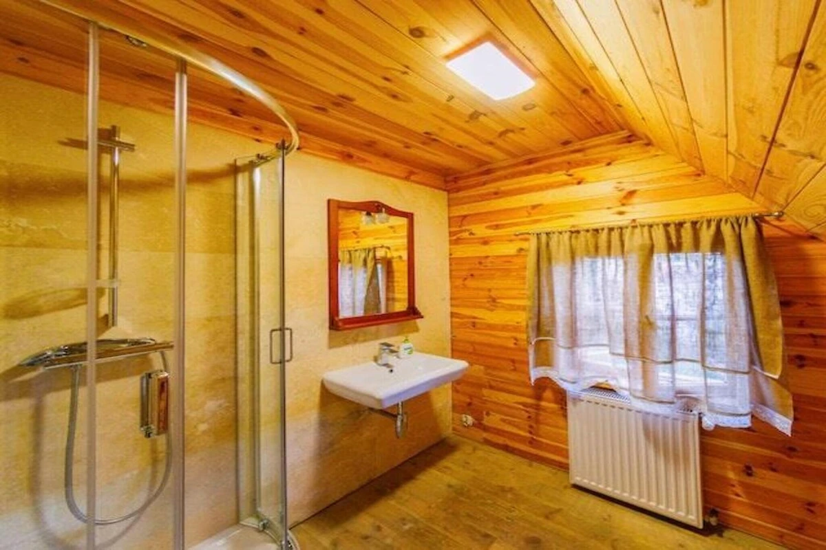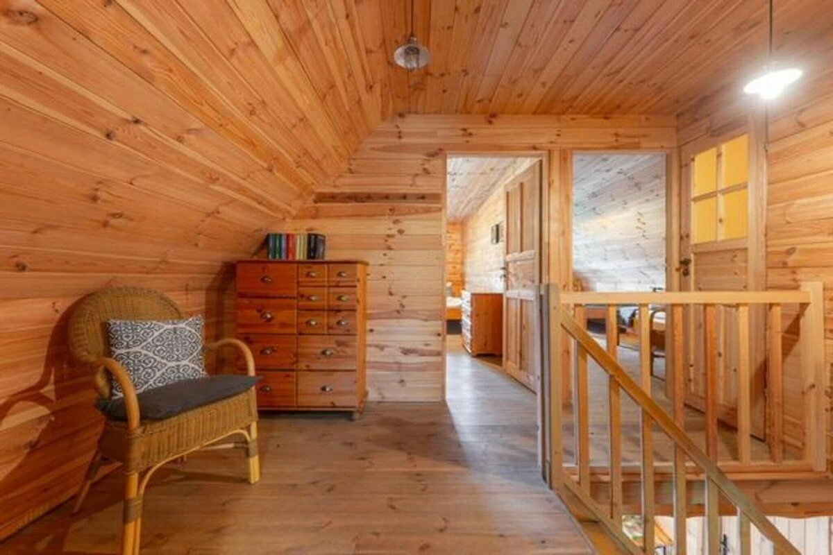 Ein stimmungsvolles, zweistöckiges Ferienhaus, umgeben von einem großen, privaten Garten (der Bereich wird mit dem Gastgeber geteilt, der im Nachbarhaus wohnt). Das gesamte Erdgeschoss besteht aus einem gemeinsamen Wohnzimmer, das mit der Küche verbunden ist. Es gibt einen großen Tisch, ein 2-Sitzer-Sofa, einen Fernseher und einen Holzofen (im Preis des Aufenthalts ist ein Starter-Set mit Brennstoff enthalten). Im ersten Stock befinden sich 3 separate Schlafzimmer, ein Badezimmer mit Dusche und ein separates WC. Das Haus verfügt über eine hervorragende Wärmedämmung und verfügt über zwei Heizquellen: Elektro- und Holzofen, so dass zu jeder Jahreszeit angenehme Entspannung gewährleistet ist. Es gibt auch eine Klimaanlage. Das Haus verfügt über eine sehr große, überdachte Terrasse mit Gartenmöbeln und Liegestühlen. Grillmöglichkeiten sind vorhanden. Drahtloses Internet ist verfügbar, aber aufgrund seiner Geschwindigkeit können Sie nur grundlegende Informationen im Internet abrufen.