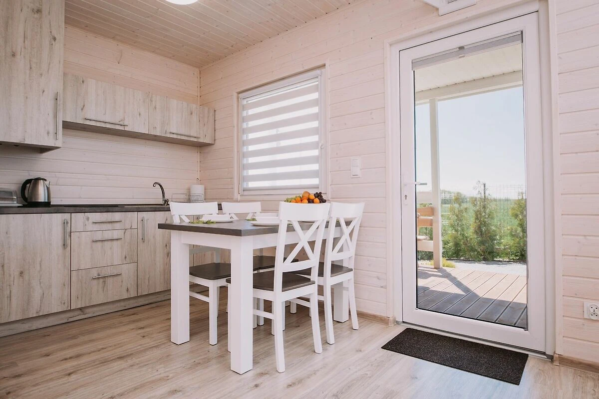 Auf dem umzäunten Grundstück steht eine Reihe von 8 einstöckigen Häusern. Jedes Haus verfügt über eine überdachte Terrasse mit Gartenmöbeln und Grillzubehör. Das Haus besteht aus einem Wohnzimmer mit Küche, einem Badezimmer mit Dusche und 2 separaten Schlafzimmern. Das Wohnzimmer verfügt über ein ausklappbares 2-Sitzer-Sofa, einen Tisch mit Stühlen und einen Fernseher. An kälteren Tagen können die Hütten beheizt werden. WLAN ist verfügbar.