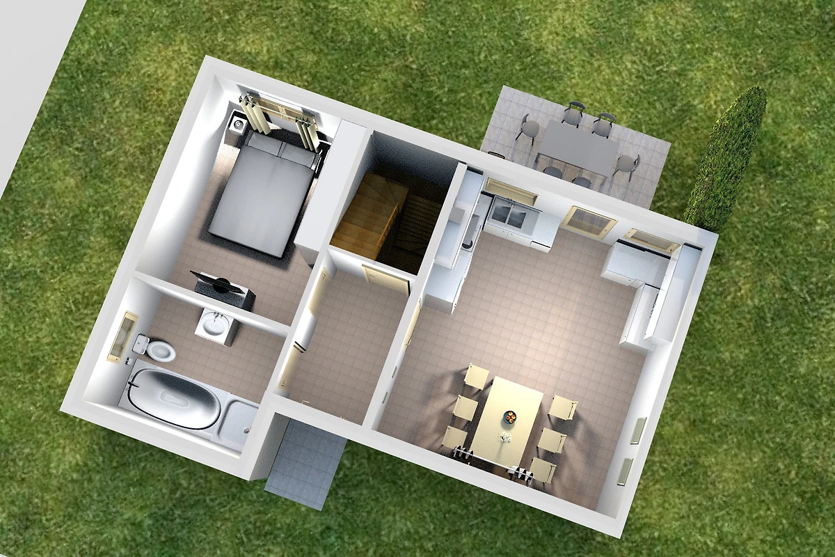 Im Erdgeschoss befinden sich ein Schlafzimmer mit einem Boxspringbett (160 x 200), ein Tageslichtbad sowie eine grosszügig geschnittene Küche mit Essbereich.