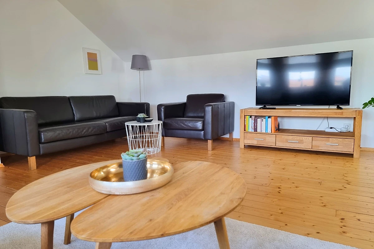 Im Obergeschoss befindet sich ein weiteres Schlafzimmer mit einem Doppelbett (160 x 200) und einem Beistellbett (90 x 200), sowie das Wohnzimmer mit einer bequemen Schlafcouch (Boxspringbett 160 x 200 cm).