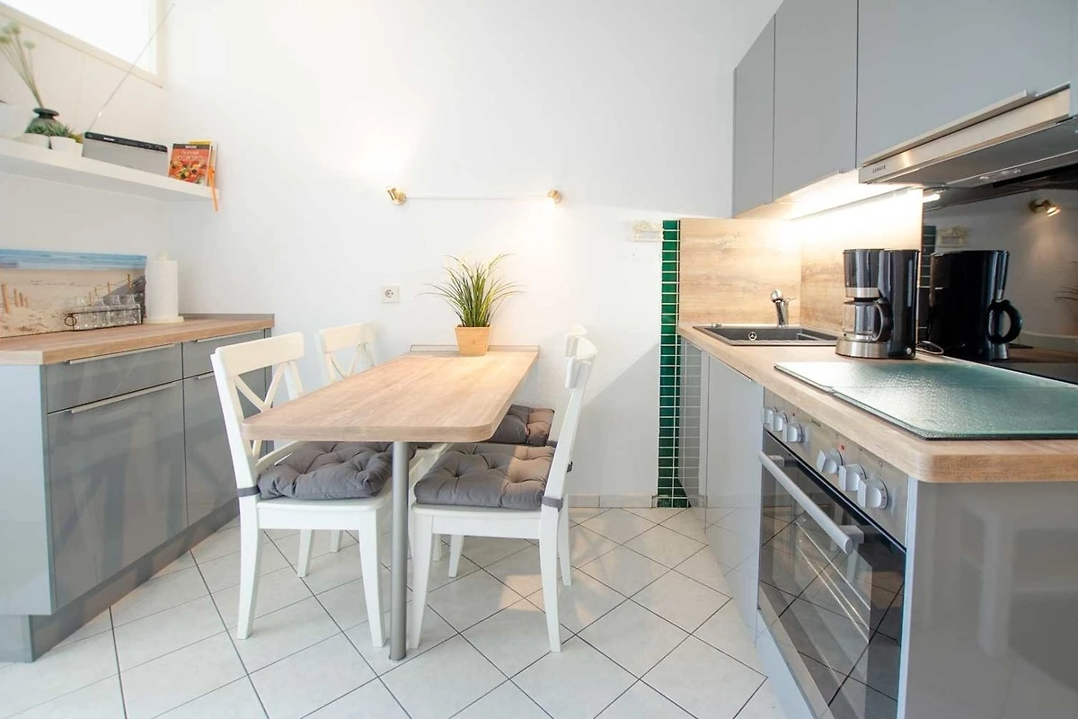 Der separate Schlafraum verfügt über zwei Einzelbetten 80*200, einen Kleiderschrank und Nachtschrank und Fernseher. In der modernen Küche können Feriengäste am Tisch mit den vier Stühlen gesellige Mahlzeiten einnehmen.