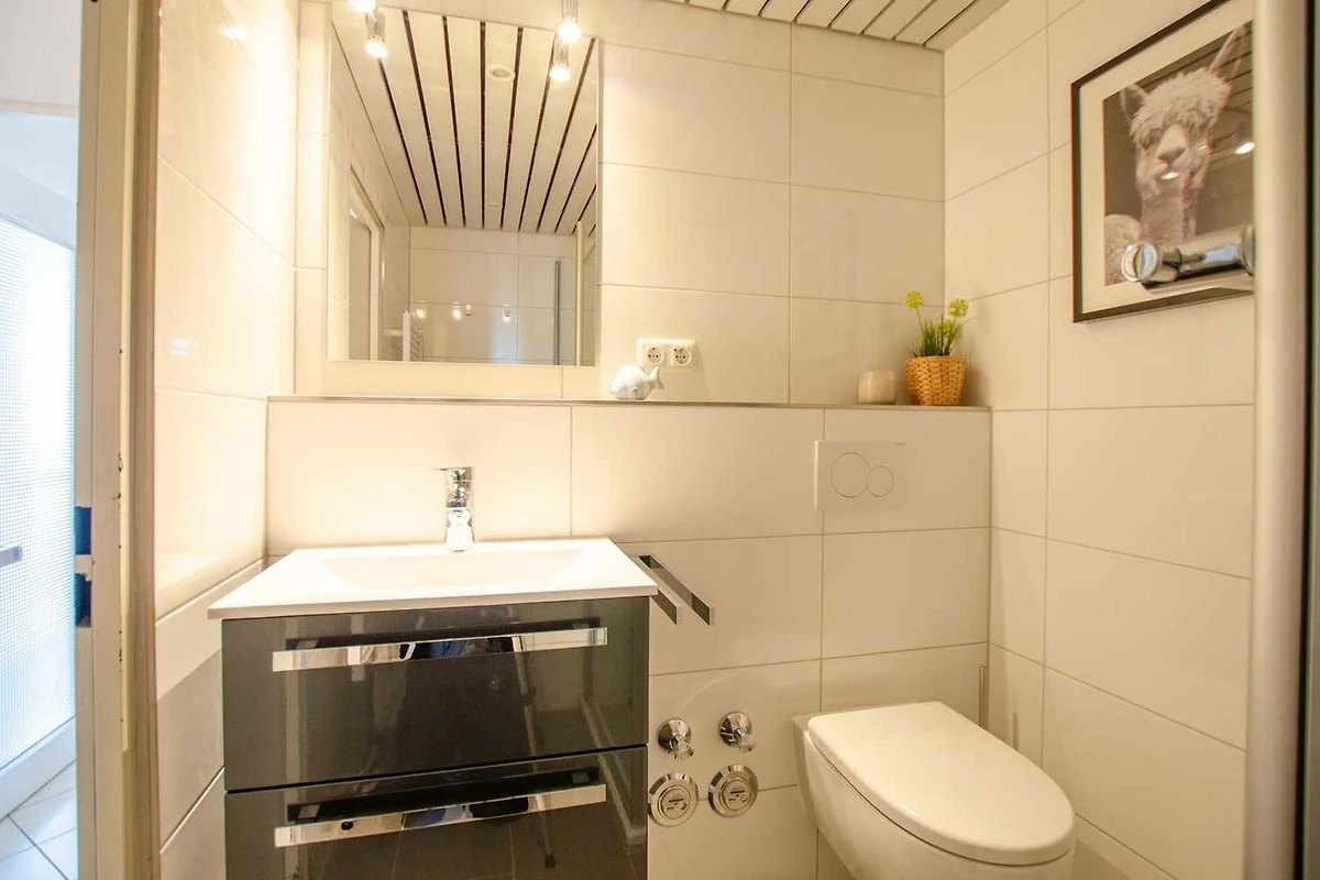 Die Ferienwohnung von Familie Bräuer verfügt zudem über ein neues Bad (2019 renoviert) mit Dusche und WC. Der Flur ist mit einer Garderobe, einem Schuhschrank und einem Spiegel ausgestattet.