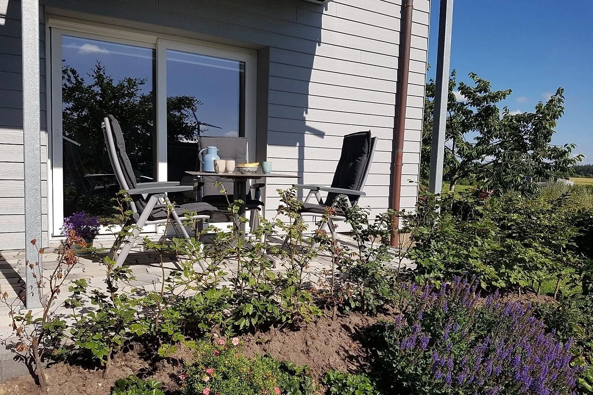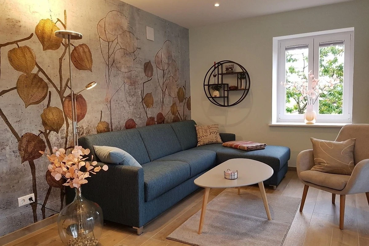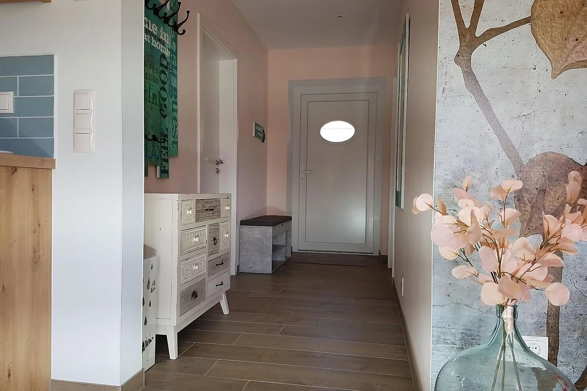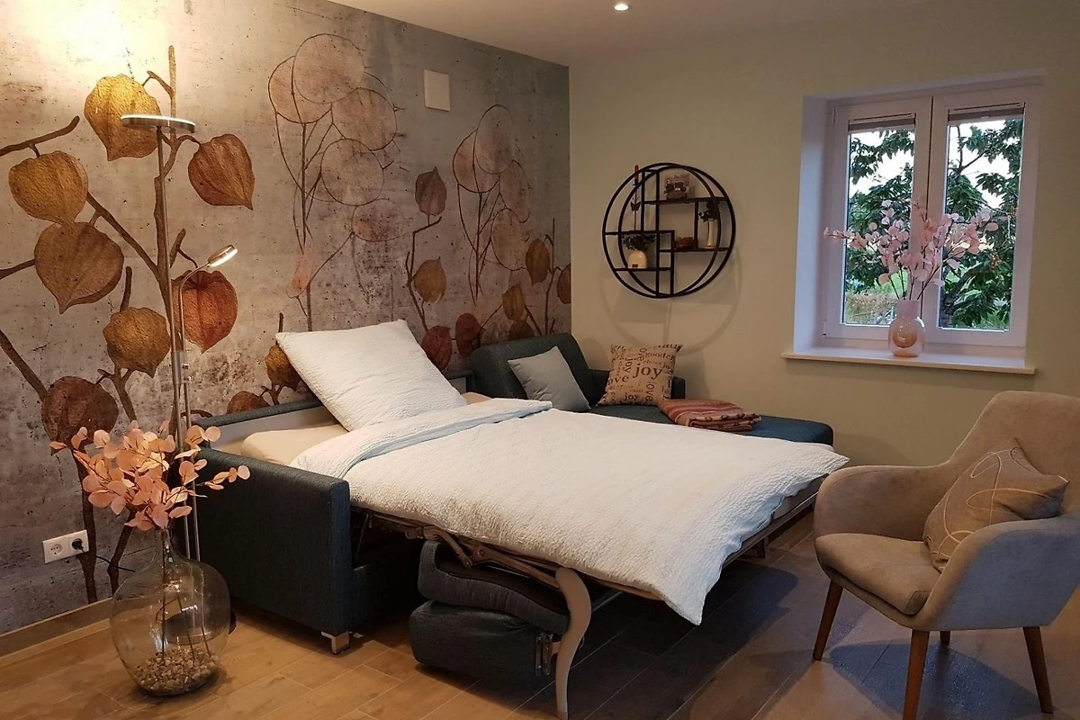 Diese im Juli 2022 fertiggestellte Wohnung mit 53 qm Wohnfläche im Erdgeschoss und einer Terrasse Richtung Westen ist für 2 - 4 Personen geeignet. Sie verfügt über ein Schlafzimmer mit Doppelbett, ein Bad mit grosser Dusche und beheiztem Handtuchhalter, sowie eine geschmackvoll eingerichtete Diele. Es erwartet Sie eine voll ausgestattete Küche mit grosszügigem Essbereich, in der Sie mit Freude köstliche Menüs anrichten können. Die offene Küche geht über in einen kommodigen Wohnbereich mit direktem Zugang zur Terrasse, auf der Sie gemütliche Stühle mit Tisch zum Entspannen finden. Der Wohnraum verfügt über ein Smart TV, ein Digitalradio sowie über eine Couch mit integriertem Matratzenbett (140x200) und bietet somit den Schlafplatz 3+4. Ausdrucksvolle Fototapeten im Wohn- und Schlafzimmer geben dieser Wohnung ihren sehr individuellen Charme. Die Böden im Bad, in der Küche und im Wohnbereich sind mit hochwertigen Steinfliesen und Fussbodenheizung ausgestattet. Dank einer integrierten Be- und Entlüftungsanlage ist stets ein angenehmes Raumklima vorhanden. Im gemeinschaftlichen Hauswirtschaftsraum stehen Ihnen Waschmaschine, Trockner, Spüle, Akkustaubsauger, Bügelbrett und Mineralwasser kostenfrei zur Verfügung.Die Vermietung der Ferienwohnungen erfolgt ausschliesslich zu touristischen Zwecken.Die Aufnahme von Monteuren oder die Nutzung der Wohnungen zu gewerblichen Zwecken ist nur nach vorheriger Absprache möglich. Die Wohnungen werden, ebenfalls nach vorheriger Absprache, an max. 1 bis 2 Personen pro Wohnung vermietet. Bei längeren Aufenthalten wird wöchentlich eine Zwischenreinigung zu den aktuellen Konditionen durchgeführt.