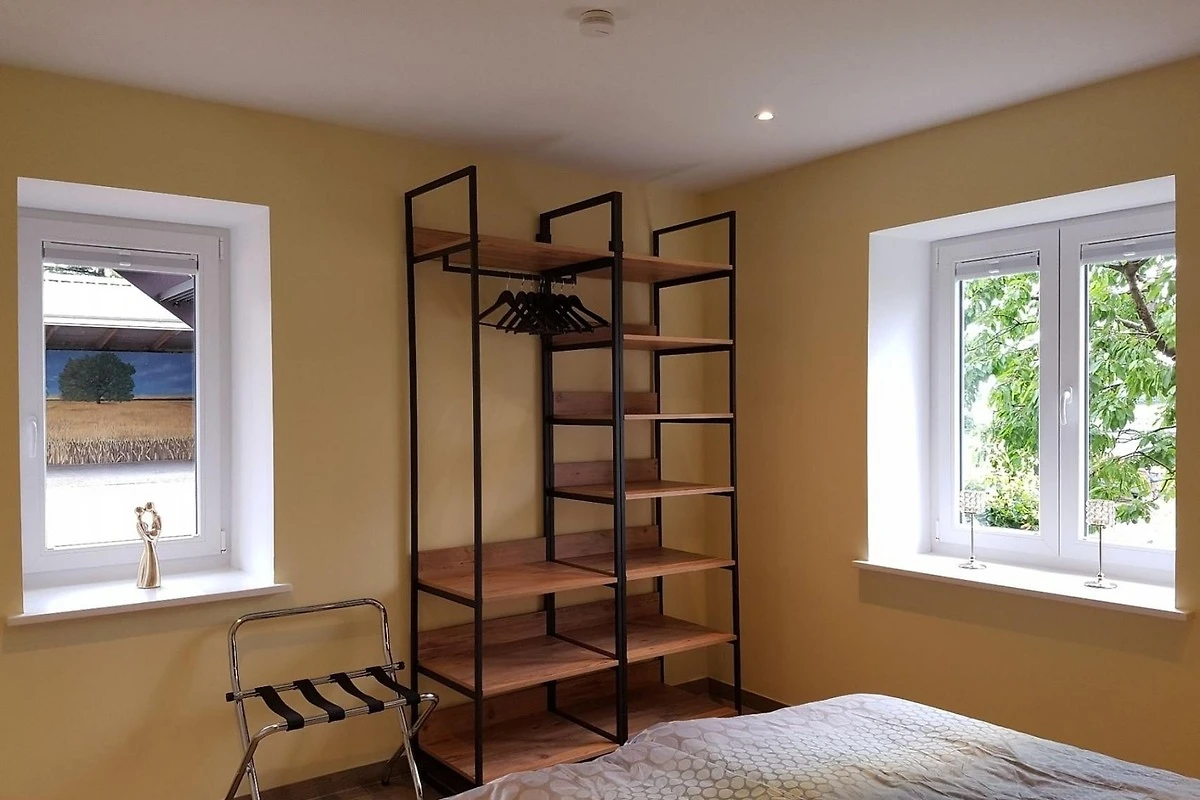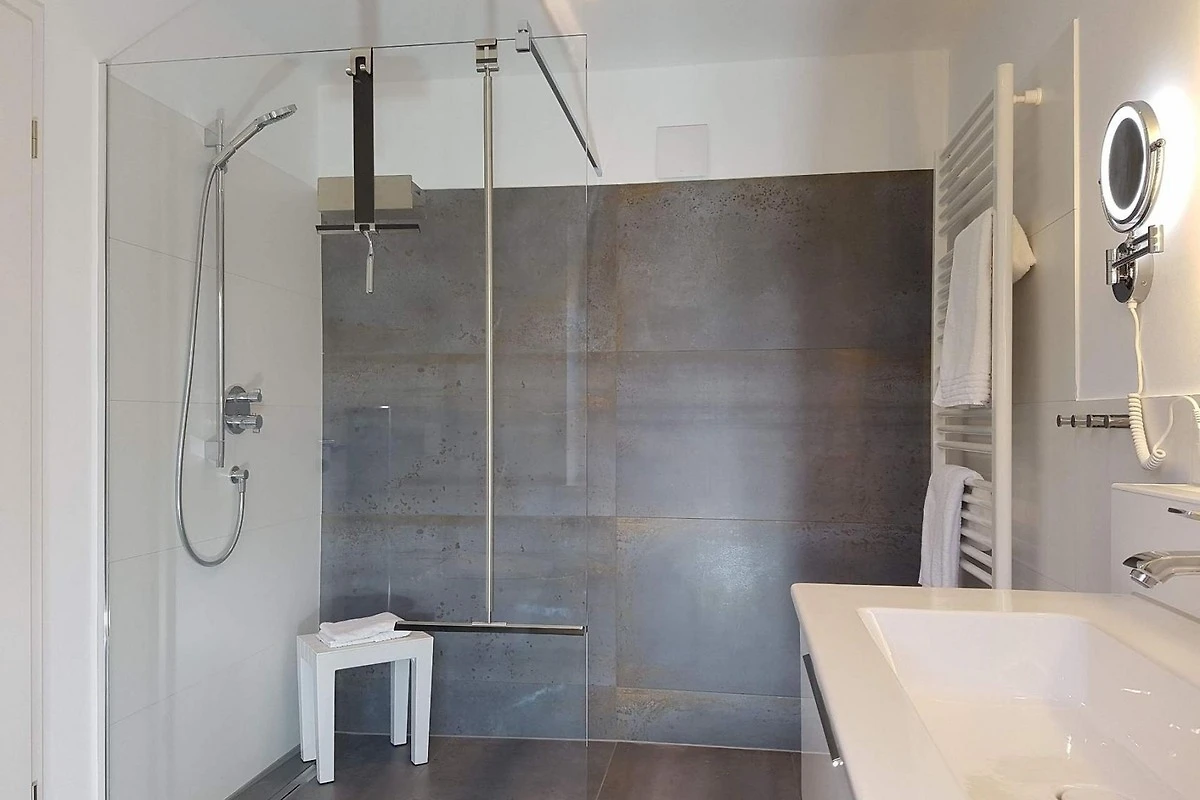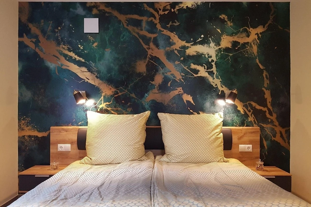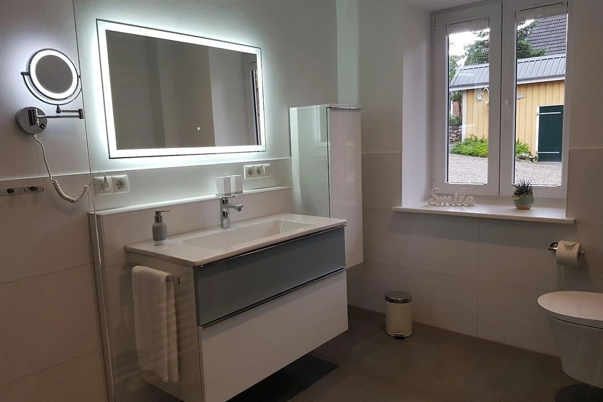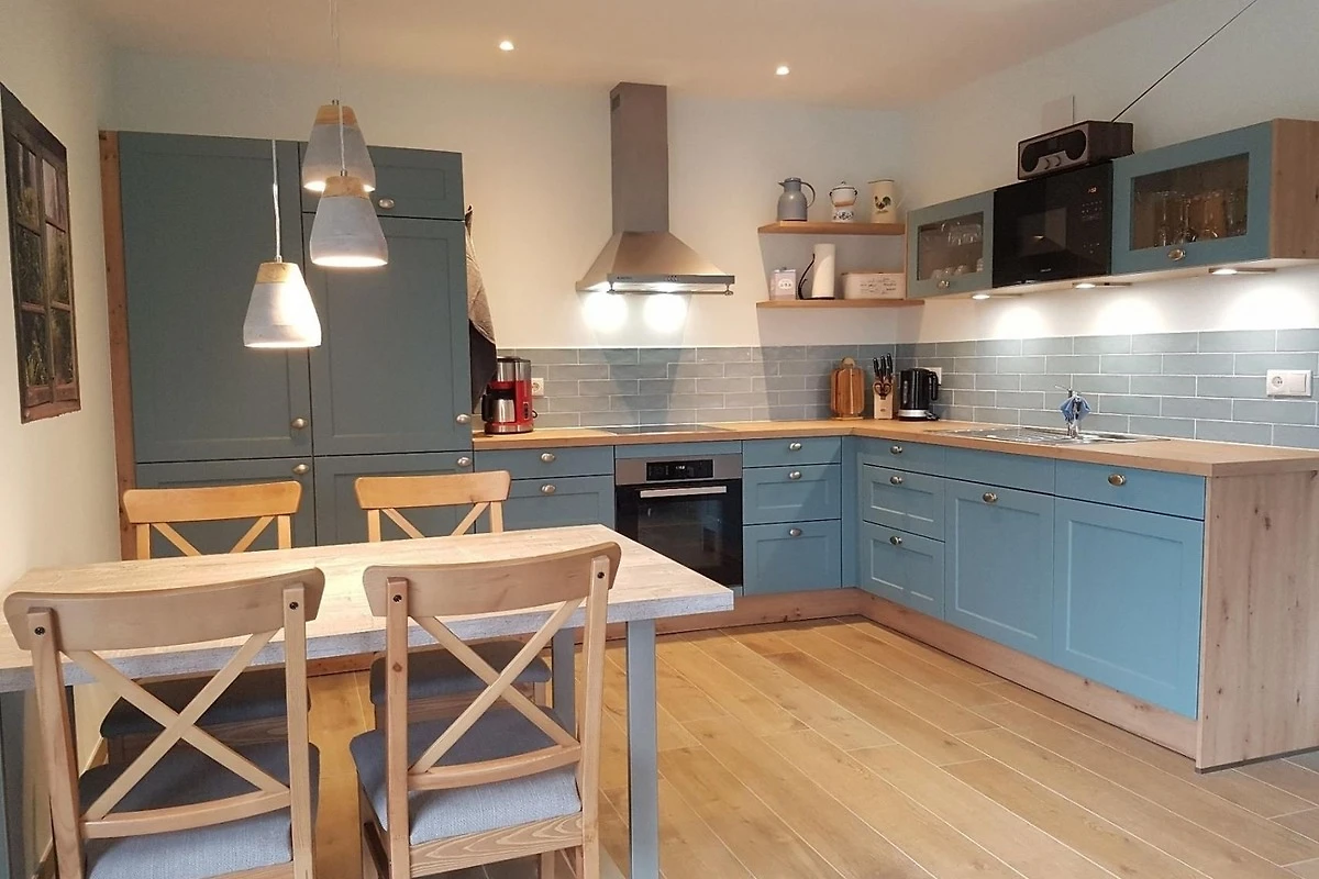 Diese im Juli 2022 fertiggestellte Wohnung mit 53 qm Wohnfläche im Erdgeschoss und einer Terrasse Richtung Westen ist für 2 - 4 Personen geeignet. Sie verfügt über ein Schlafzimmer mit Doppelbett, ein Bad mit grosser Dusche und beheiztem Handtuchhalter, sowie eine geschmackvoll eingerichtete Diele. Es erwartet Sie eine voll ausgestattete Küche mit grosszügigem Essbereich, in der Sie mit Freude köstliche Menüs anrichten können. Die offene Küche geht über in einen kommodigen Wohnbereich mit direktem Zugang zur Terrasse, auf der Sie gemütliche Stühle mit Tisch zum Entspannen finden. Der Wohnraum verfügt über ein Smart TV, ein Digitalradio sowie über eine Couch mit integriertem Matratzenbett (140x200) und bietet somit den Schlafplatz 3+4. Ausdrucksvolle Fototapeten im Wohn- und Schlafzimmer geben dieser Wohnung ihren sehr individuellen Charme. Die Böden im Bad, in der Küche und im Wohnbereich sind mit hochwertigen Steinfliesen und Fussbodenheizung ausgestattet. Dank einer integrierten Be- und Entlüftungsanlage ist stets ein angenehmes Raumklima vorhanden. Im gemeinschaftlichen Hauswirtschaftsraum stehen Ihnen Waschmaschine, Trockner, Spüle, Akkustaubsauger, Bügelbrett und Mineralwasser kostenfrei zur Verfügung.Die Vermietung der Ferienwohnungen erfolgt ausschliesslich zu touristischen Zwecken.Die Aufnahme von Monteuren oder die Nutzung der Wohnungen zu gewerblichen Zwecken ist nur nach vorheriger Absprache möglich. Die Wohnungen werden, ebenfalls nach vorheriger Absprache, an max. 1 bis 2 Personen pro Wohnung vermietet. Bei längeren Aufenthalten wird wöchentlich eine Zwischenreinigung zu den aktuellen Konditionen durchgeführt.