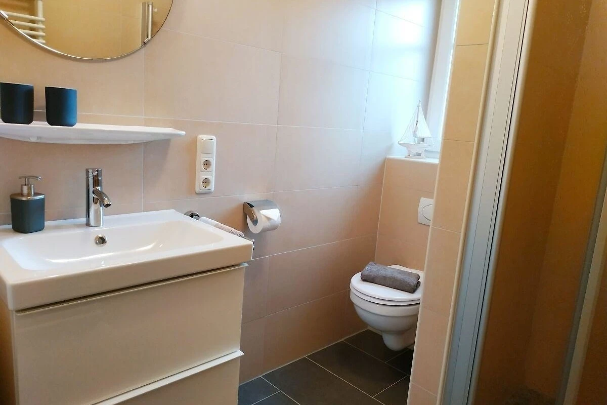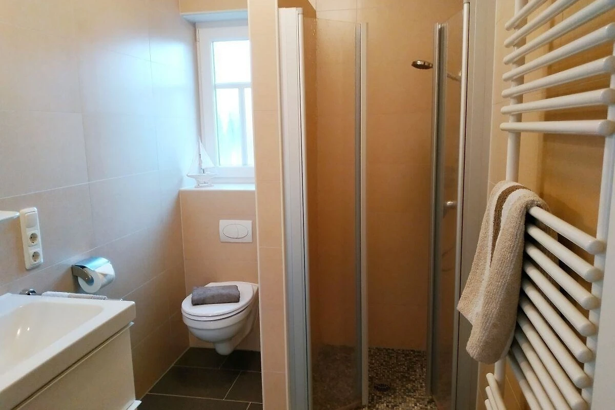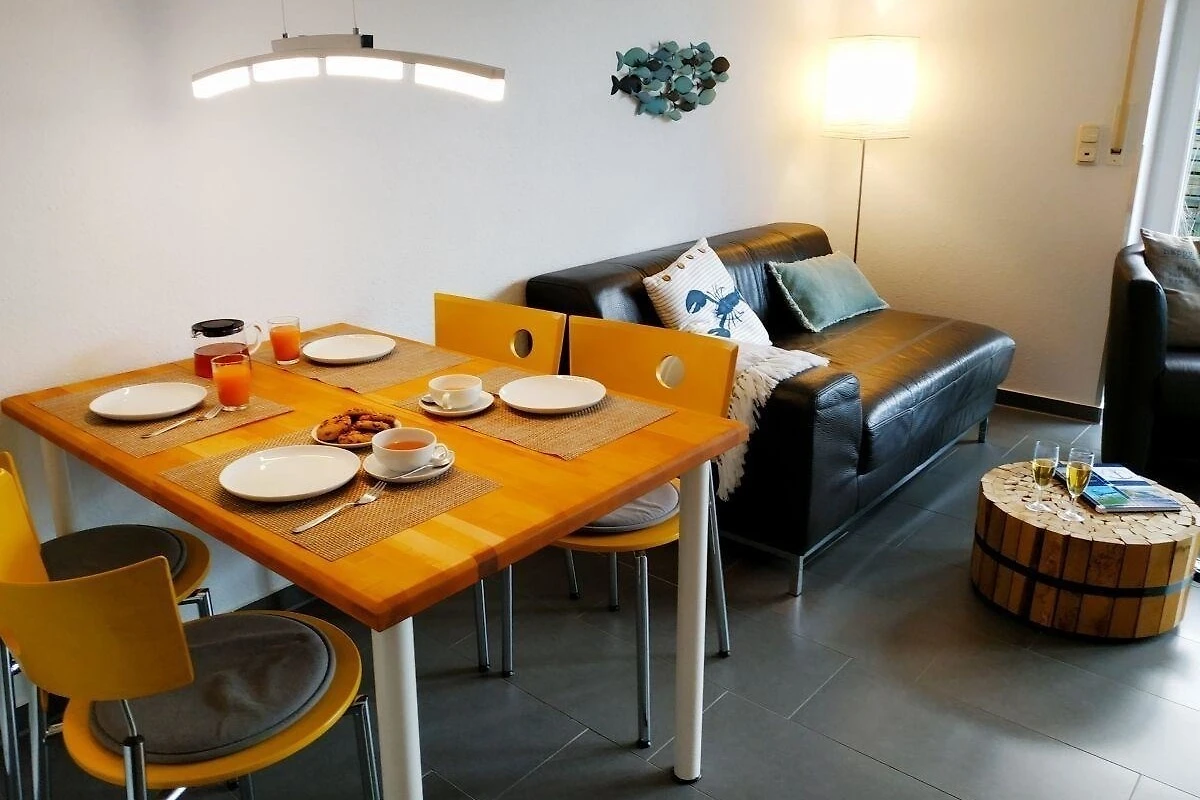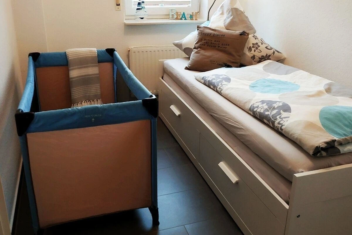 Die Ferienwohnung bietet eine moderne und komfortable Ausstattung, die allen Bedürfnissen gerecht wird. Sie verfügt über zwei Schlafzimmer mit jeweils einem Doppelbett, ideal für Familien oder Paare. Die offene Küche ist bestens ausgestattet mit einem Geschirrspüler, Elektro-/Gasherd, Backofen, Mikrowelle, Kühlschrank und einer Kaffeemaschine. Ein Essbereich mit Tisch und Stühlen lädt zum Verweilen ein. Das Badezimmer ist mit einer bodengleichen Dusche, einem Haartrockner sowie einem Fenster ausgestattet. WLAN sorgt für eine digitale Anbindung. Für Unterhaltung stehen eine HiFi-Anlage, ein TV sowie ein DVD/Blu-Ray-Player zur Verfügung. Zudem ist die Unterkunft allergikergeeignet und bietet einen Starterset mit Pflegeprodukten. Für die kleinen Gäste gibt es einen Kinderhochstuhl und Kinderspielzeug. Eine Waschmaschine, Reinigungsmittel sowie Spiele runden das Angebot ab. Ein Sonnen-Schirm ergänzt die Ausstattung für entspannte Stunden im Freien.