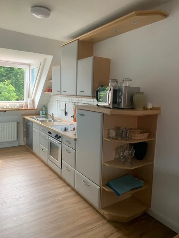 Die leicht vom Wohnbereich abgetrennte Küche ist voll ausgestattet. (Siehe Liste)