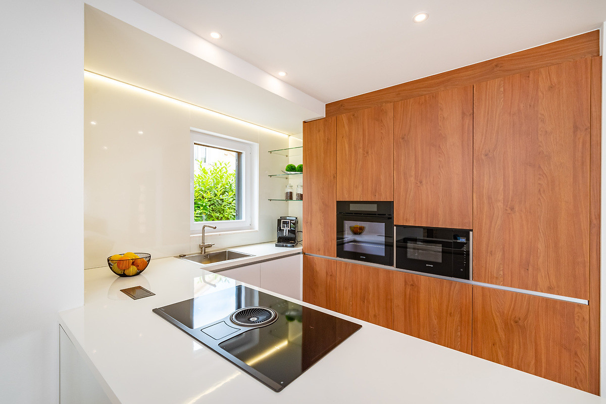 Parterre: (offene Küche(Kochplatte(4 Kochplatten, Ceranfeld), Wasserkocher, Kaffeemaschine, Backofen, Spülmaschine, Kühl-/Gefrierkombination)