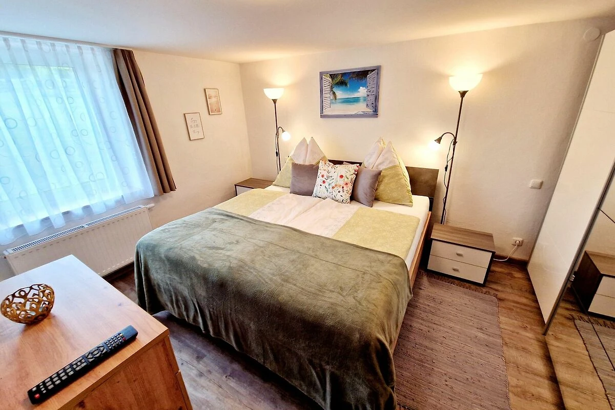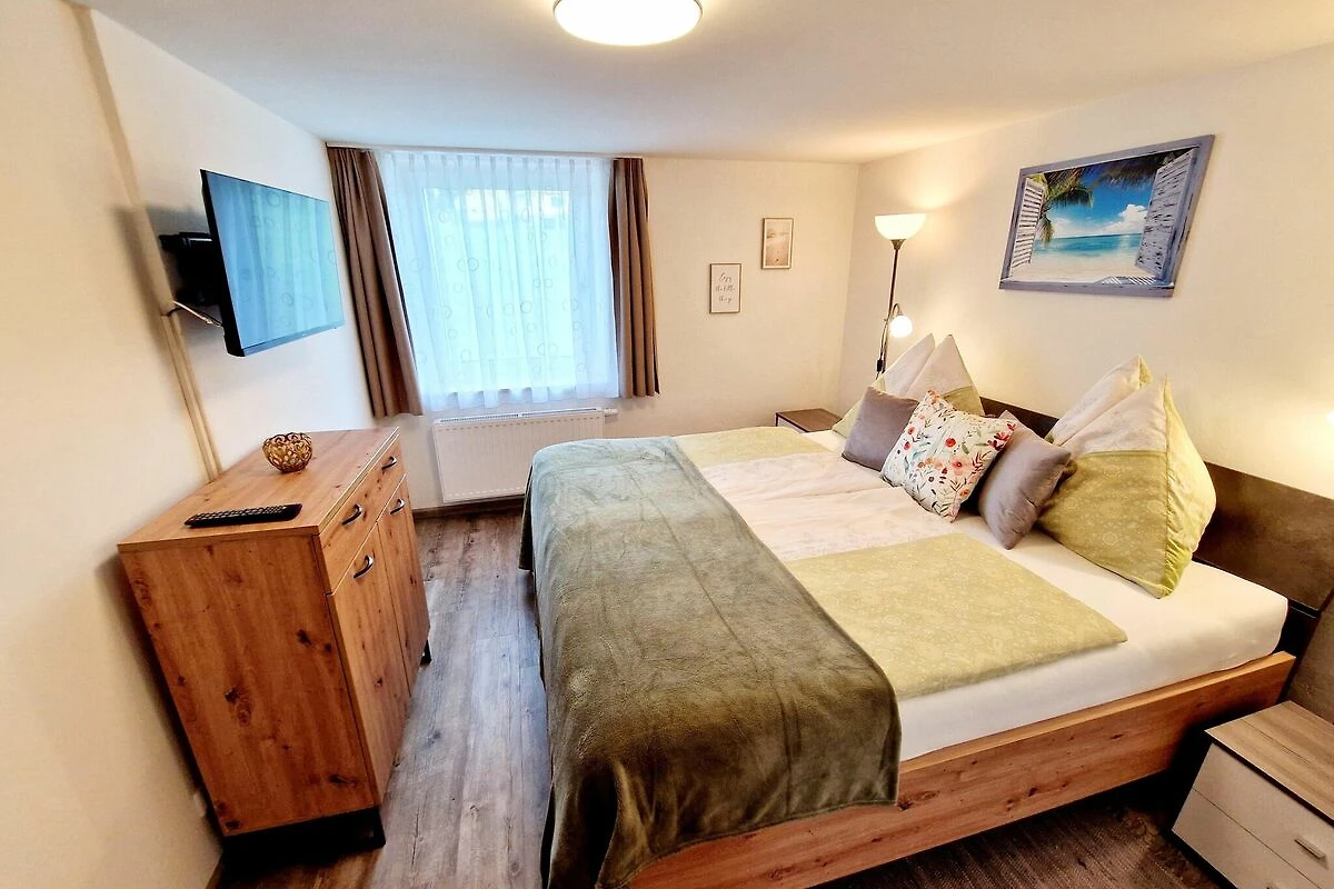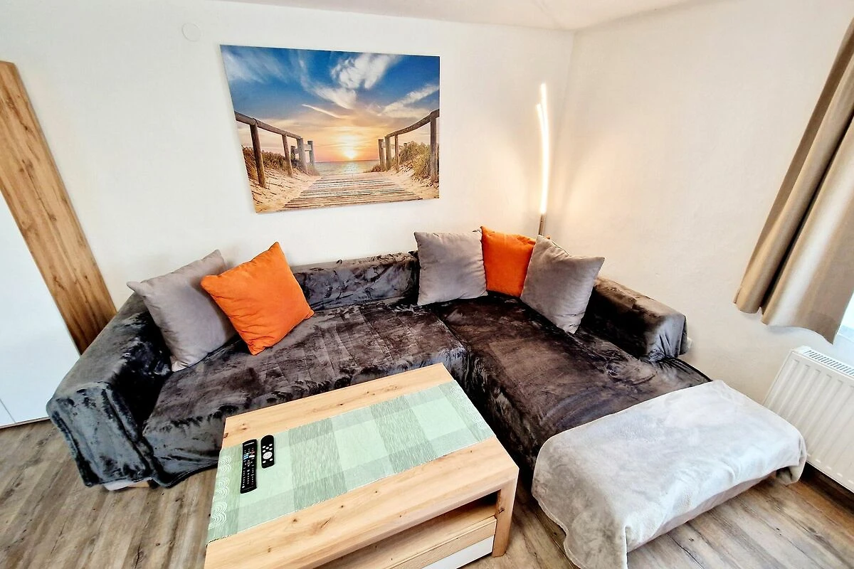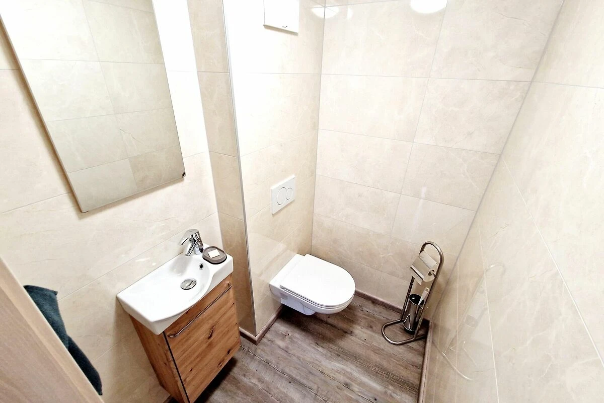 In der 1. Etage: (Wohnzimmer(Sitzecke), Küche(Esstisch, Kochherd, Backofen, Kühlschrank), Schlafzimmer(Doppelbett, TV), Schlafzimmer(Doppelbett, Doppelschlafcouch, TV), Badezimmer(Dusche, Waschbecken, Toilette), Toilette(Waschbecken))