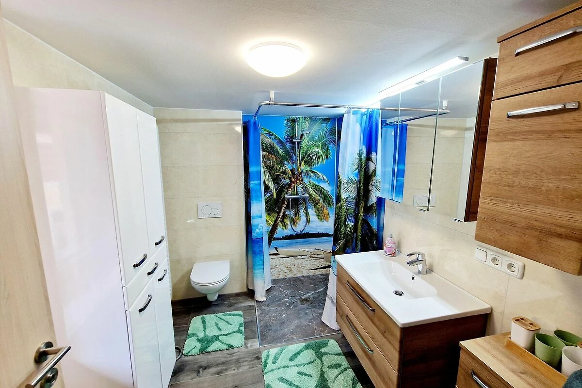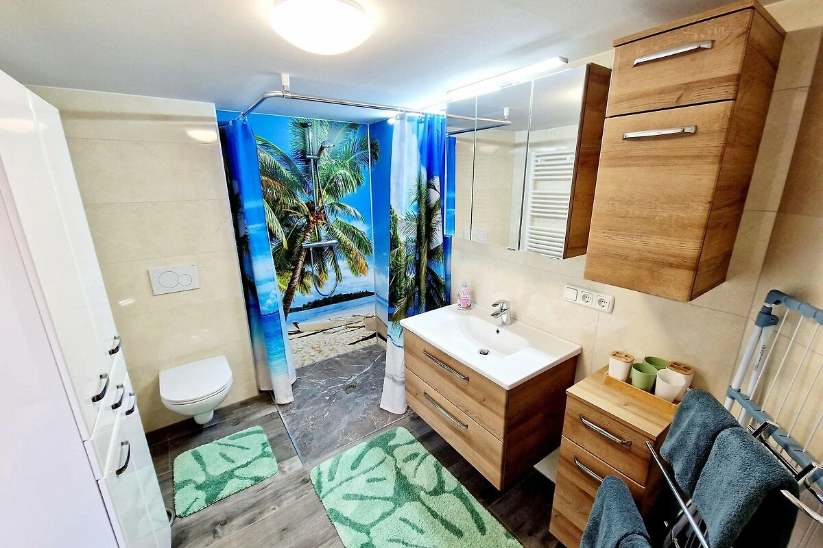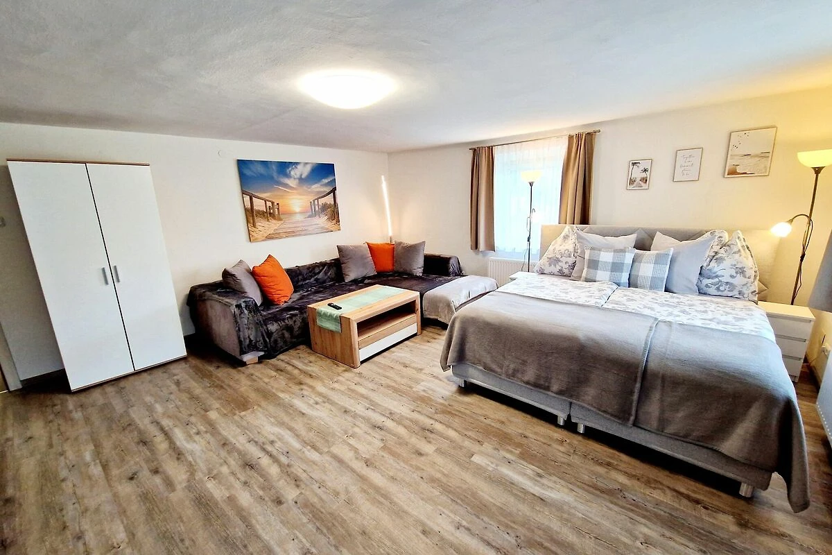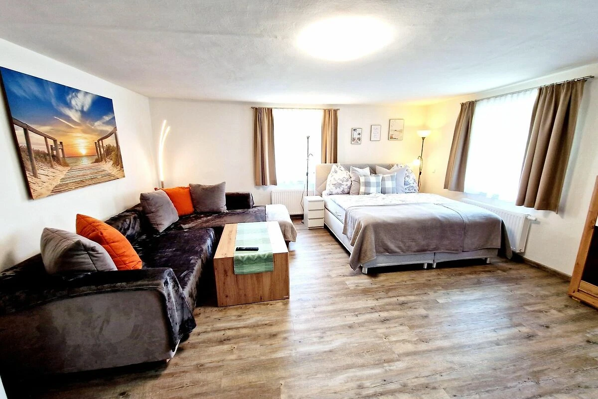 In der 1. Etage: (Wohnzimmer(Sitzecke), Küche(Esstisch, Kochherd, Backofen, Kühlschrank), Schlafzimmer(Doppelbett, TV), Schlafzimmer(Doppelbett, Doppelschlafcouch, TV), Badezimmer(Dusche, Waschbecken, Toilette), Toilette(Waschbecken))