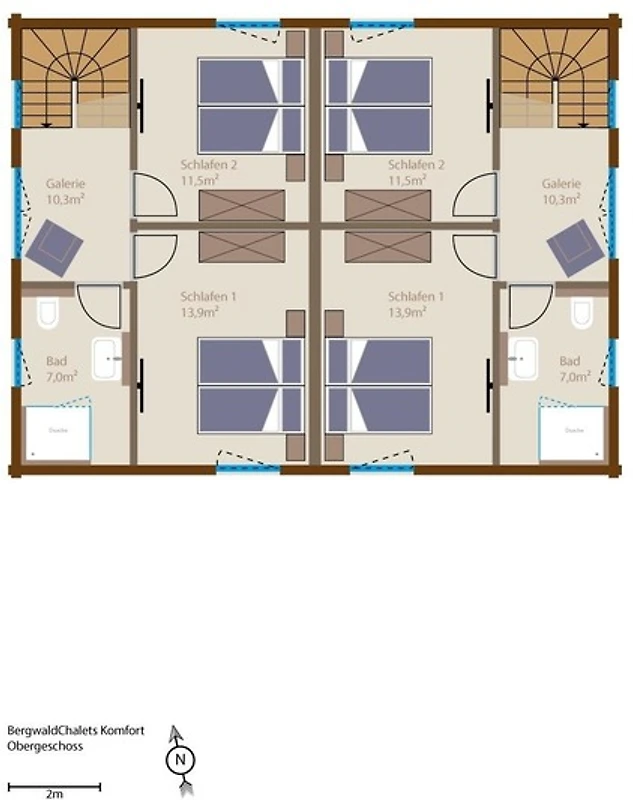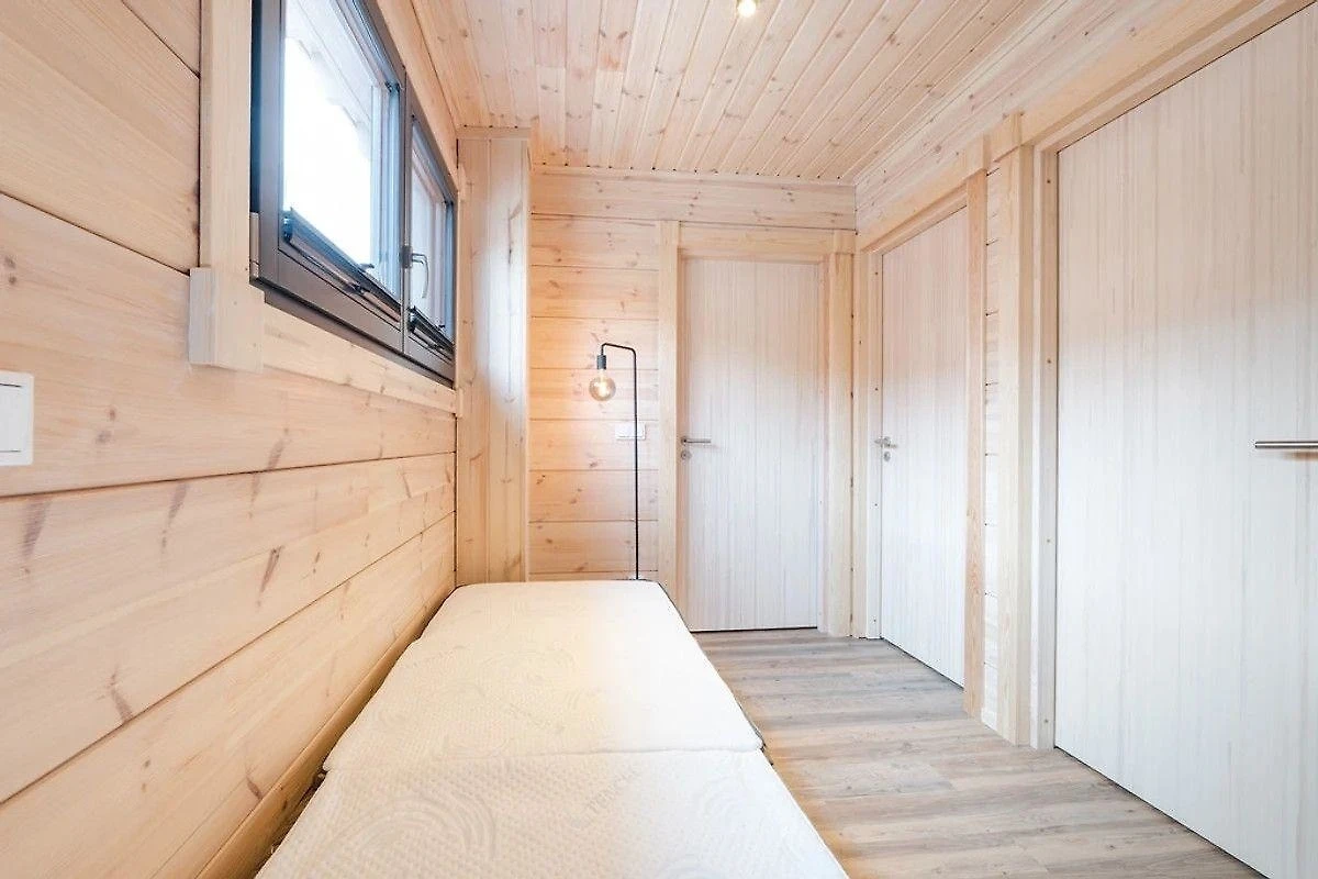 Im Haus führt im Empfangsbereich eine massive Eichentreppe ins Obergeschoss. Dort befinden sich die beiden Schlafzimmer mit komfortablen Boxspringbetten, bezogen mit allergikerfreundlicher Bettwäsche, und geräumigen Schiebetürenschränken mit Kommodenschubladen. In jedem Schlafzimmer befindet sich ein SmartTV mit Soundbar. Auf beiden Seiten der Betten sind praktischerweise je zwei Steckdosen sowie eine Leselampe. Das grosse Bad mit der von Glas umgebenen Regendusche befindet sich wie auch die Galerie mit dem Schlafsessel ebenfalls dort.
