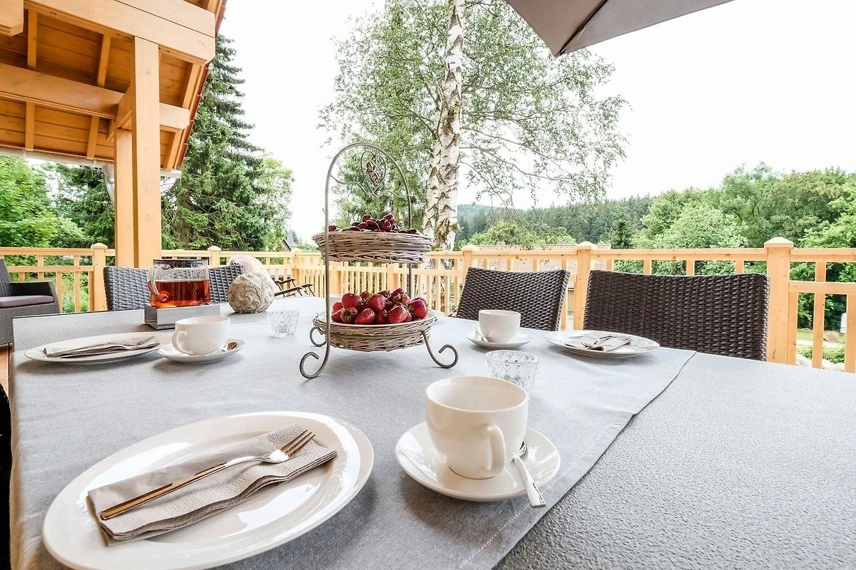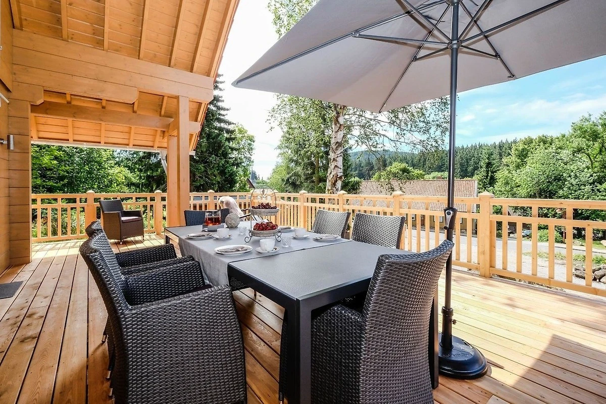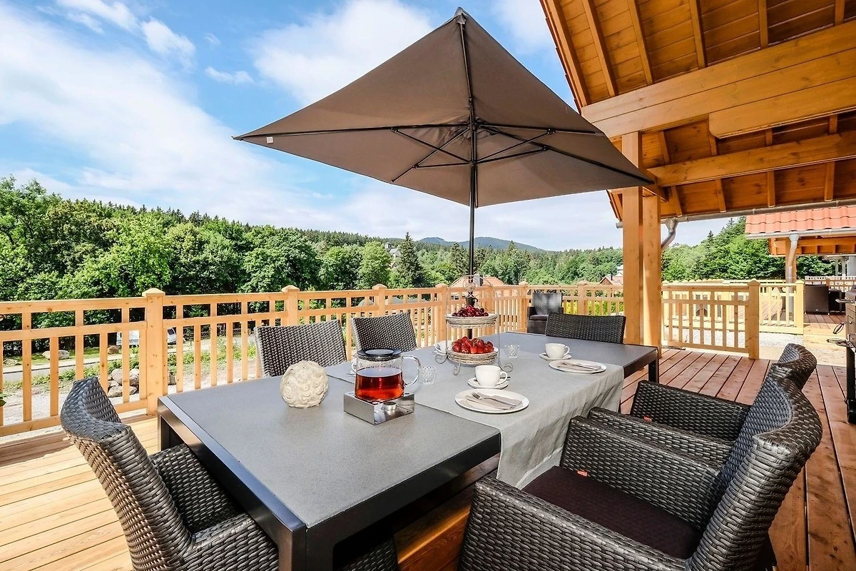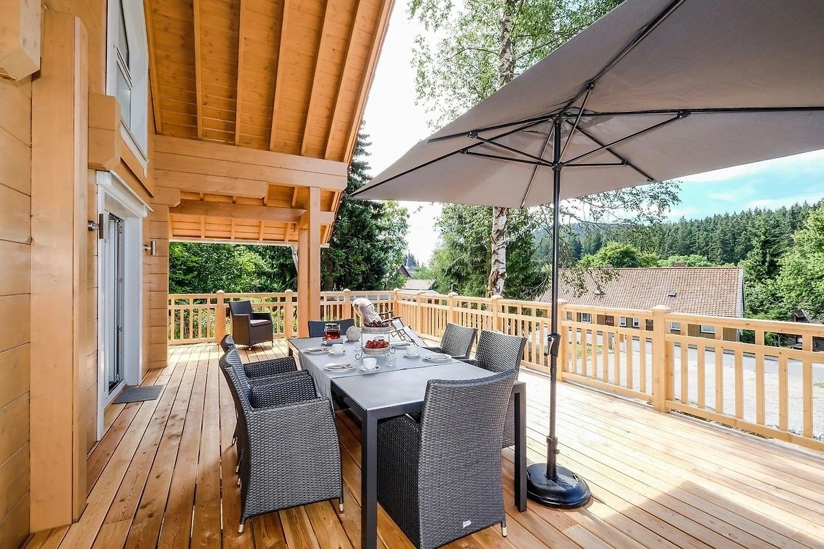 Die 60 qm grosse teilüberdachte nach Süd-West ausgerichtete Panorama-Terrasse mit 3 Meter-Dachüberstand bietet einen einzigartigen Blick auf die Schierker Bergwelt. Im Herbst erinnert die Aussicht mit ihrem Blätter-Farbspiel an den "Indian Summer".
