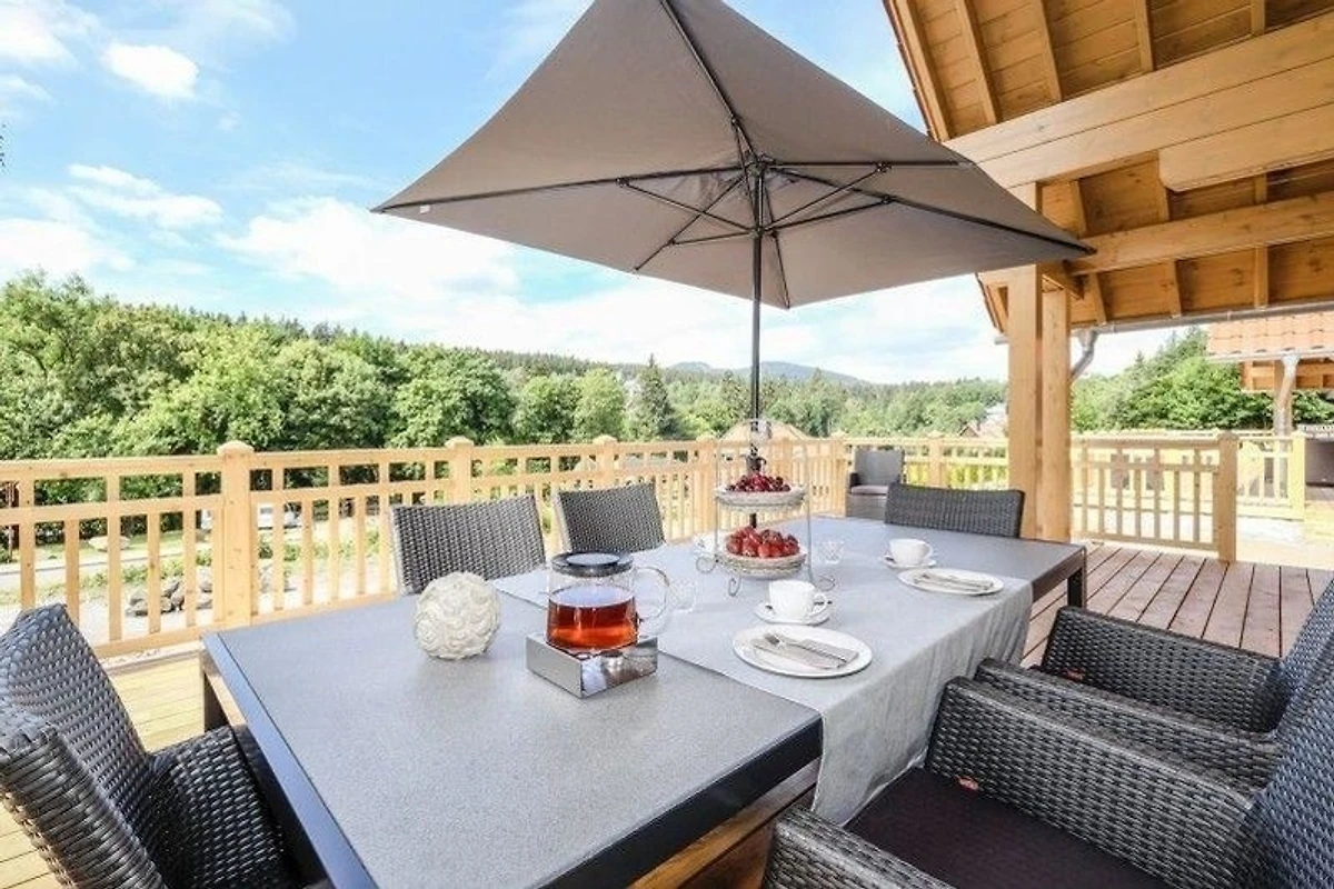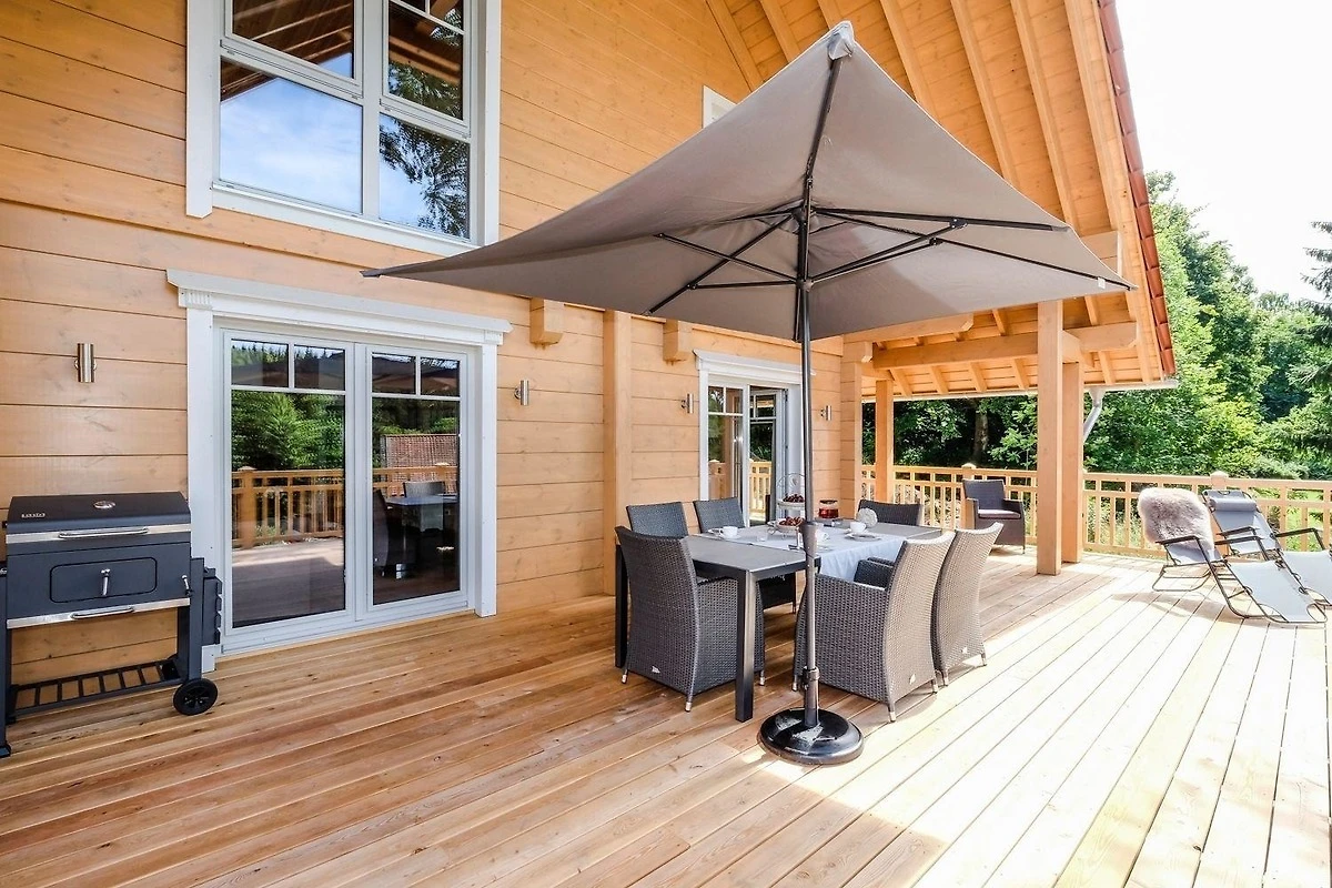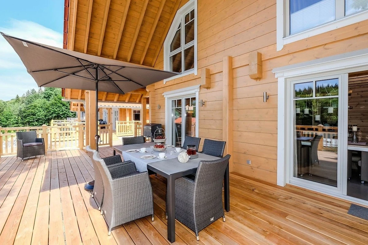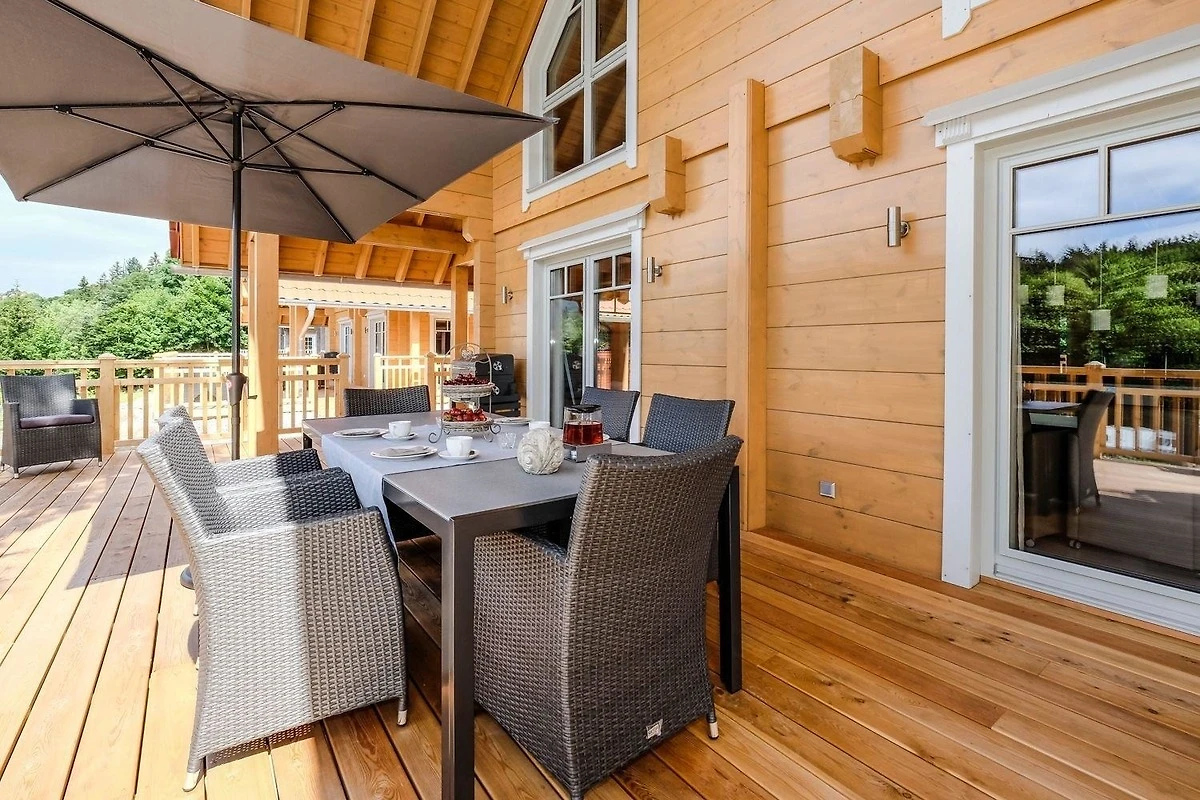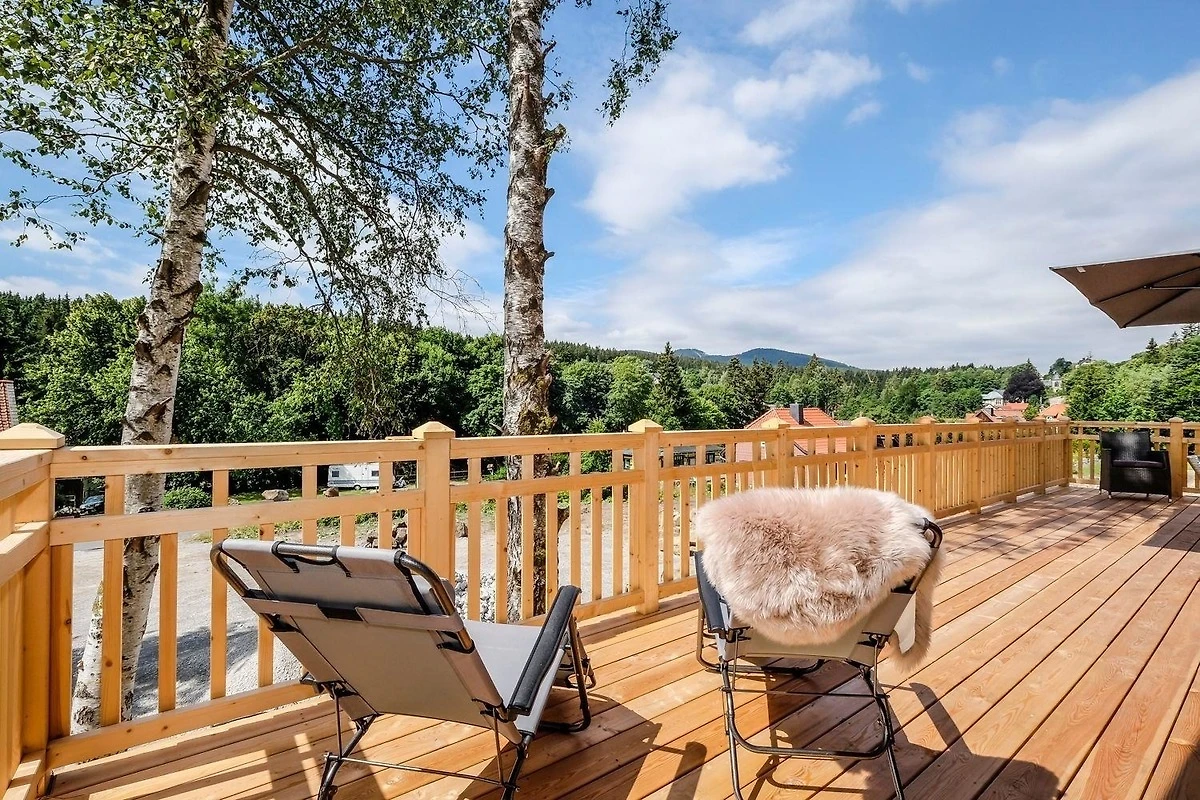 Die 60 qm grosse teilüberdachte nach Süd-West ausgerichtete Panorama-Terrasse mit 3 Meter-Dachüberstand bietet einen einzigartigen Blick auf die Schierker Bergwelt. Im Herbst erinnert die Aussicht mit ihrem Blätter-Farbspiel an den "Indian Summer".