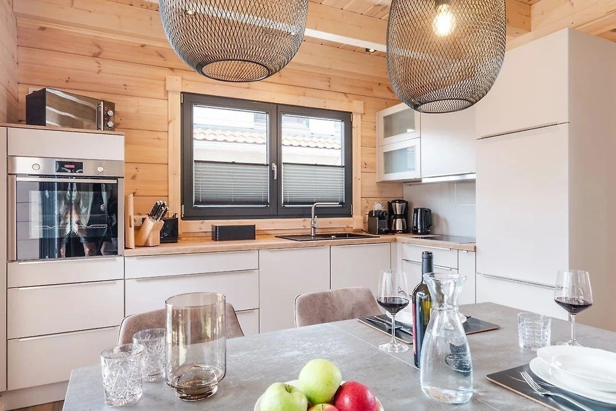 Im Erdgeschoss wartet die Sauna auf ihre Gäste. Dort ist auch das zweite kleinere Bad mit gleicher Ausstattung zu finden. Weiter den Flur entlang erreichen unsere Gäste den Wohnbereich mit top ausgestatteter moderner Küche und einem verlängerbaren Esstisch mit hochwertigen bequemen Sesseln mit Blick durch die breite Glasfront auf die Terrasse.
