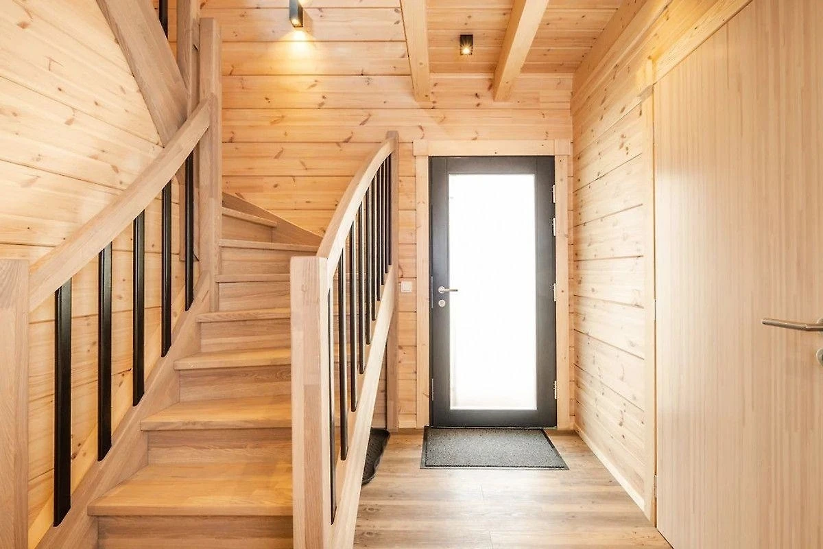 Im Haus führt im Empfangsbereich eine massive Eichentreppe ins Obergeschoss. Dort befinden sich die beiden Schlafzimmer mit komfortablen Boxspringbetten und geräumigen Schiebetürenschränken. Das grosse Bad mit der von Glas umgebenen Regendusche befindet sich wie auch die Galerie mit dem Schlafsessel ebenfalls dort.