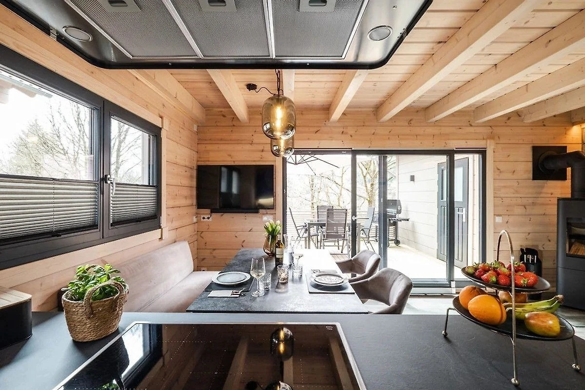 Im Erdgeschoss ist das zweite kleinere Bad mit gleicher Ausstattung zu finden. Weiter den Flur entlang erreichen unsere Gäste den Wohnbereich mit top ausgestatteter moderner Küche mit Kochinsel, einem verlängerbaren Esstisch mit hochwertigen drehbaren Sesseln und einer Bank mit Blick durch die breite Glasfront auf die Terrasse.