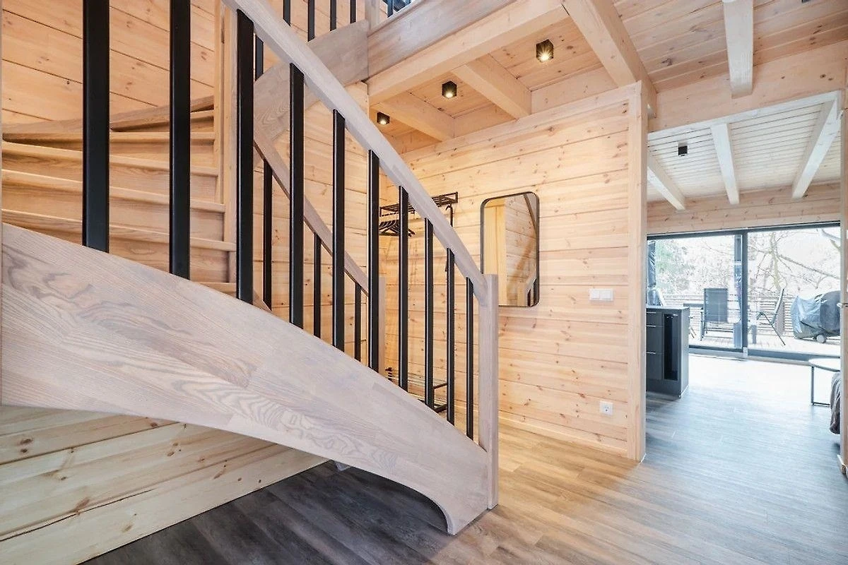 Im Haus führt im Empfangsbereich eine massive Eichentreppe ins Obergeschoss. Dort befinden sich die beiden Schlafzimmer mit komfortablen Boxspringbetten und geräumigen Schiebetürenschränken. Das grosse Bad mit der gläsernen Walk-In-Regendusche befindet sich wie auch die Galerie mit dem Schlafsessel ebenfalls dort.