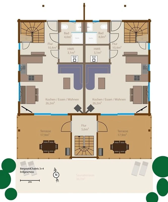 Die Doppelhaushälften sind durch eine Schall- und Brandschutzwand und auf der Terrasse durch einen Nebenraum getrennt, so dass jeder Mieter seine Privatsphäre geniessen kann.