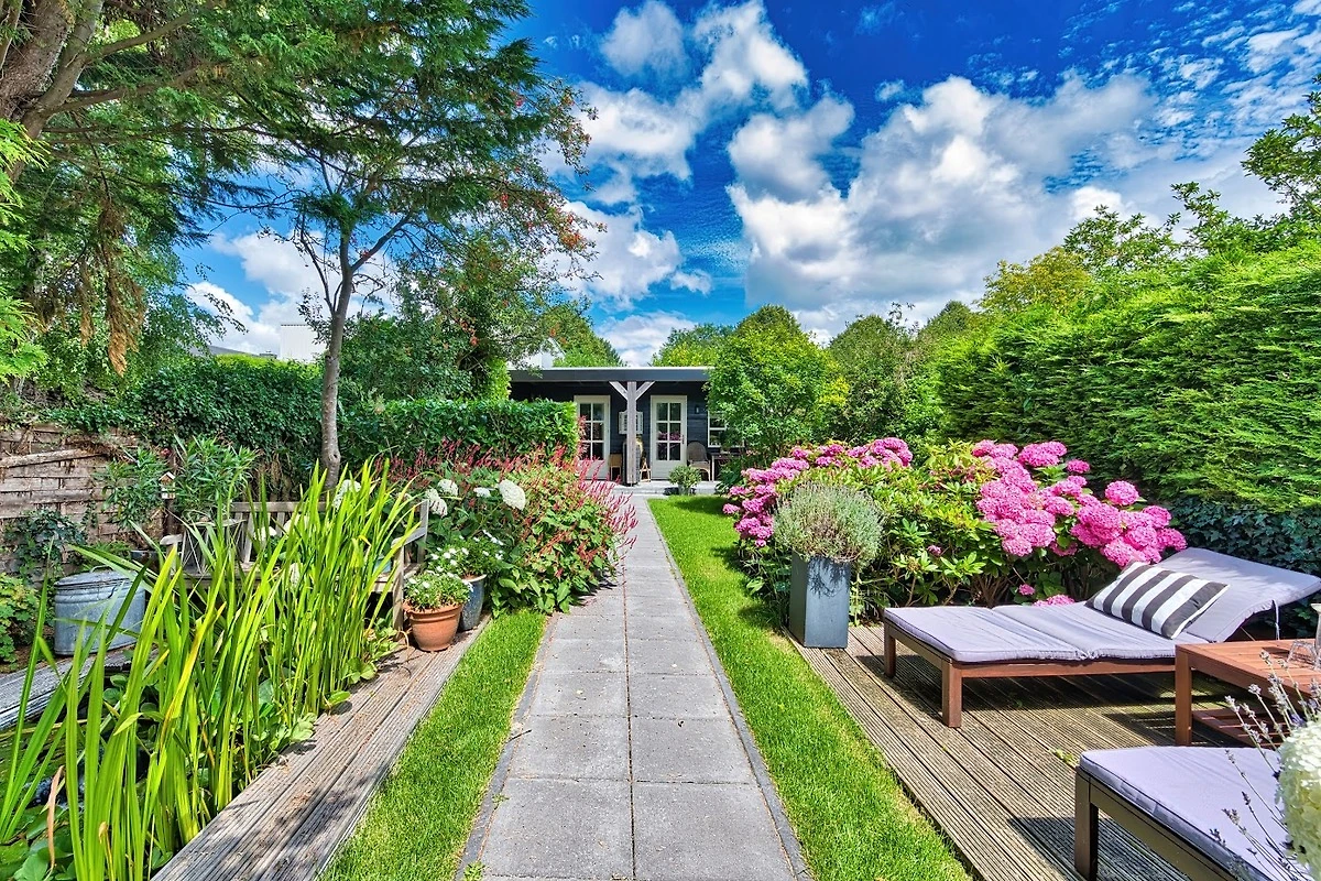 • Geräumiger Schreibtisch mit Blick auf den Garten