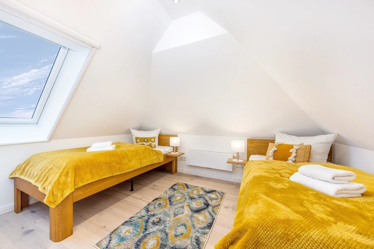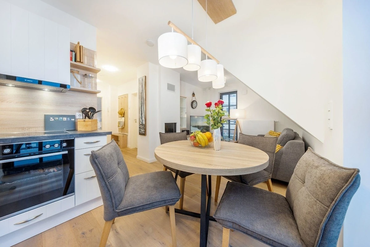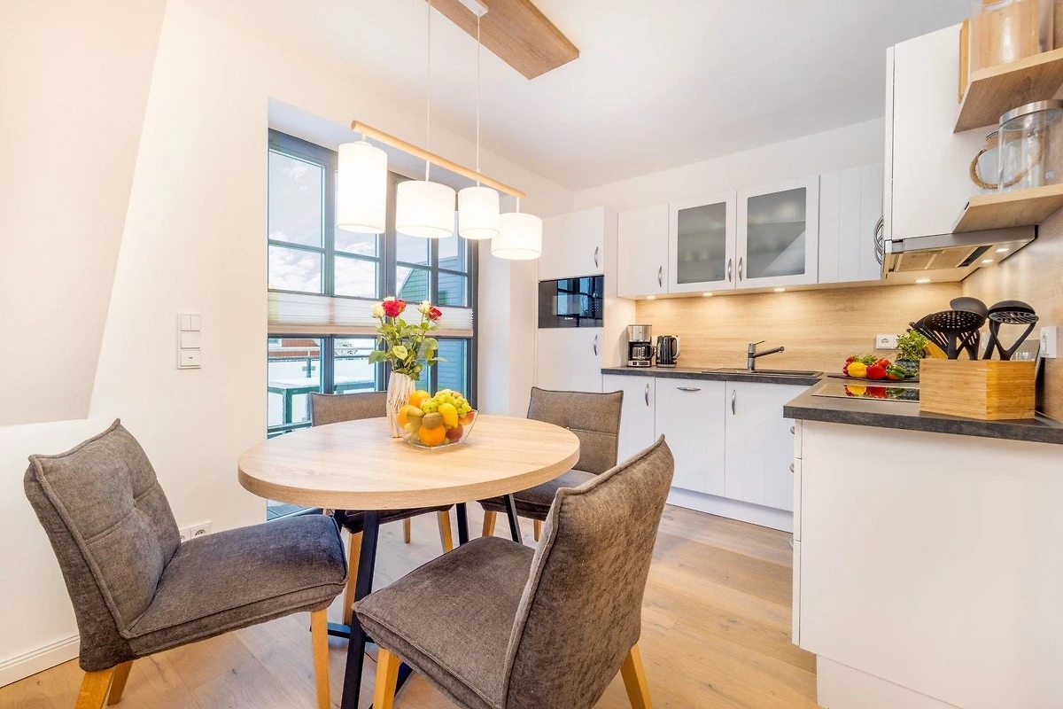 Die Ferienwohnung bietet eine stilvolle und komfortable Unterkunft mit einem durchdachten Raumkonzept. Sie verfügt über zwei Schlafzimmer, in denen ein Doppelbett und zwei Einzelbetten Platz finden. Das Badezimmer ist mit einer bodengleichen Dusche ausgestattet und besticht durch ein Fenster, einen Kosmetikspiegel sowie einen Haartrockner. Die offene Küche ist ein Highlight der Wohnung und bietet moderne Annehmlichkeiten wie einen Geschirrspüler, einen Elektro-/Gasherd, einen Backofen, eine Mikrowelle und zahlreiche Kleingeräte wie einen Toaster und eine Kaffeemaschine. Ein Esstisch lädt zu gemeinsamen Mahlzeiten ein. Die technische Ausstattung umfasst WLAN, einen TV und eine HiFi-Anlage. Für zusätzlichen Komfort sorgt der Kamin/Kachelofen. Praktische Extras wie eine Waschmaschine, ein Bügeleisen sowie ein Erste-Hilfe-Set sind ebenfalls vorhanden. Die Wohnung ist allergikergeeignet und bietet einen Parkplatz. Brettspiele und Fliegengitter sorgen für zusätzlichen Wohnkomfort.