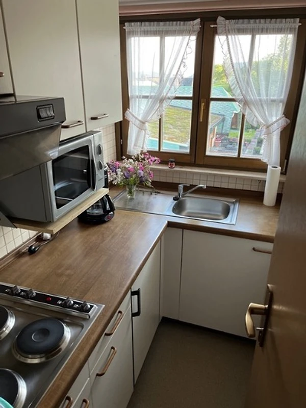 - Küche mit Herd, Kühlschrank mit Gefrierfach, Mikrowelle, Toaster, Wasserkocher und Küchengrundausstattung