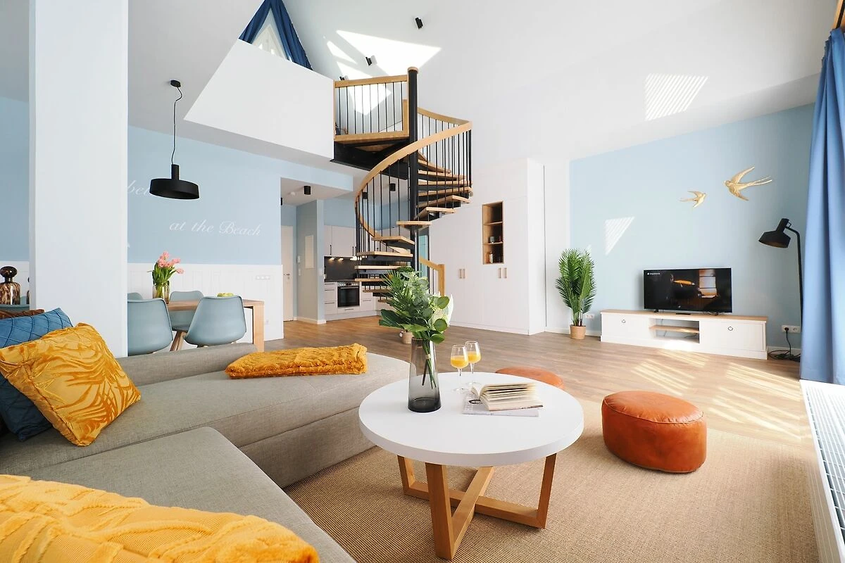 Entspannen Sie auf Ihrem privaten Balkon auf der Seebrücke Heringsdorf! Die 2023 renovierte, lichtdurchflutete Ferienwohnung ist auf zwei Ebenen, mit einer Empore auf der oberen Etage konzipiert und vom darunter liegenden Wohnbereich aus über eine Treppe zu betreten. Sowohl der separate Schlafbereich auf der Empore mit dem Boxspringdoppelbett, als auch das gemütliche Eckschlafsofa im Wohnzimmer mit Smart-TV bieten Ihnen angenehme Nächte. Neben dem komfortablen Esstisch im Wohnbereich finden Sie auch genügend Platz für Ihre Garderobe und haben einen direkten Ausgang zum Balkon mit Sitzgarnitur, wo Sie den herrlichen Weitblick auf die Ostsee genießen können. Die offene Küchenzeile im Wohnraum ist mit Ceranfeld, Backofen, Geschirrspüler,Kühl-Gefrierkombination, Spülmaschine, Toaster, Mikrowelle, Wasserkocher und allen erforderliche Küchenutensilien ausgestattet. Das Badezimmer überzeugt mit einer ebenerdigen Dusche, einem Waschbecken, einem WC sowie einem großen Spiegel inklusive Kosmetikspiegel. Für Ihren Komfort sind Bettwäsche, Handtücher, Reinigungs- und Waschmittel als Erstausstattung inklusive. Der WLAN-Zugang ist kostenfrei nutzbar. Auf Wunsch stellen wir ein Kinderreisebett und einen Kinderhochstuhl gegen einen Aufpreis zur Verfügung. Vor dem Haus gibt es nur Be-und Endladeparkplätze, als Alternative bieten wir für das örtliche Parkhaus in Heringsdorf ermäßigte Parkkarten gemäß aktueller Preise. Die Parkkarte erhalten Sie bei Anreise in unserem Servicebüro. Haustiere sind in dieser Ferienwohnung herzlich willkommen, hierfür berechnen wir Gebühr gemäß aktueller Preise. Im Untergeschoss der Seebrücke steht Ihnen ein abschließbarer Fahrradraum sowie ein kleiner Waschraum mit Waschmaschine, Trockner, Bügelbrett und Bügeleisen kostenfrei zur Verfügung.