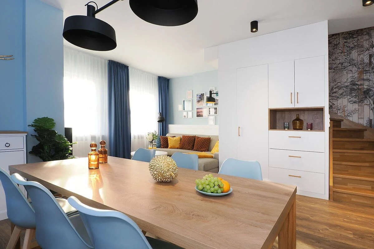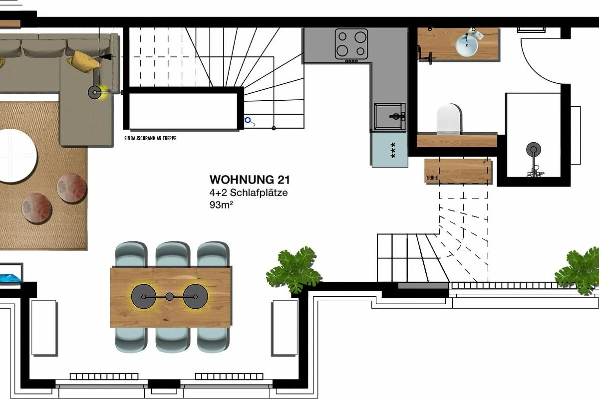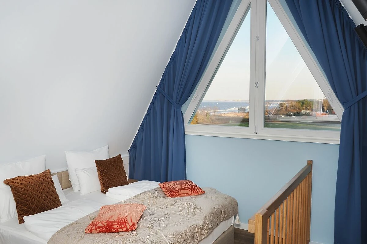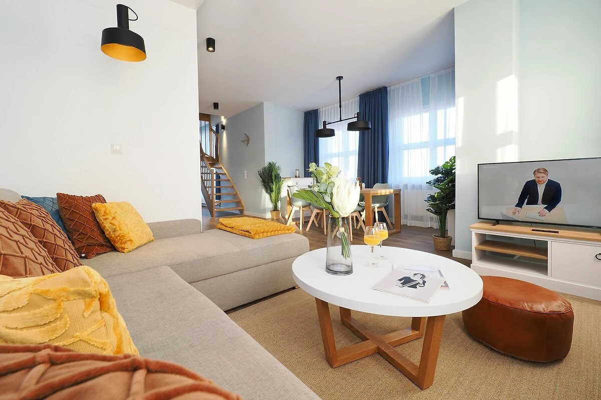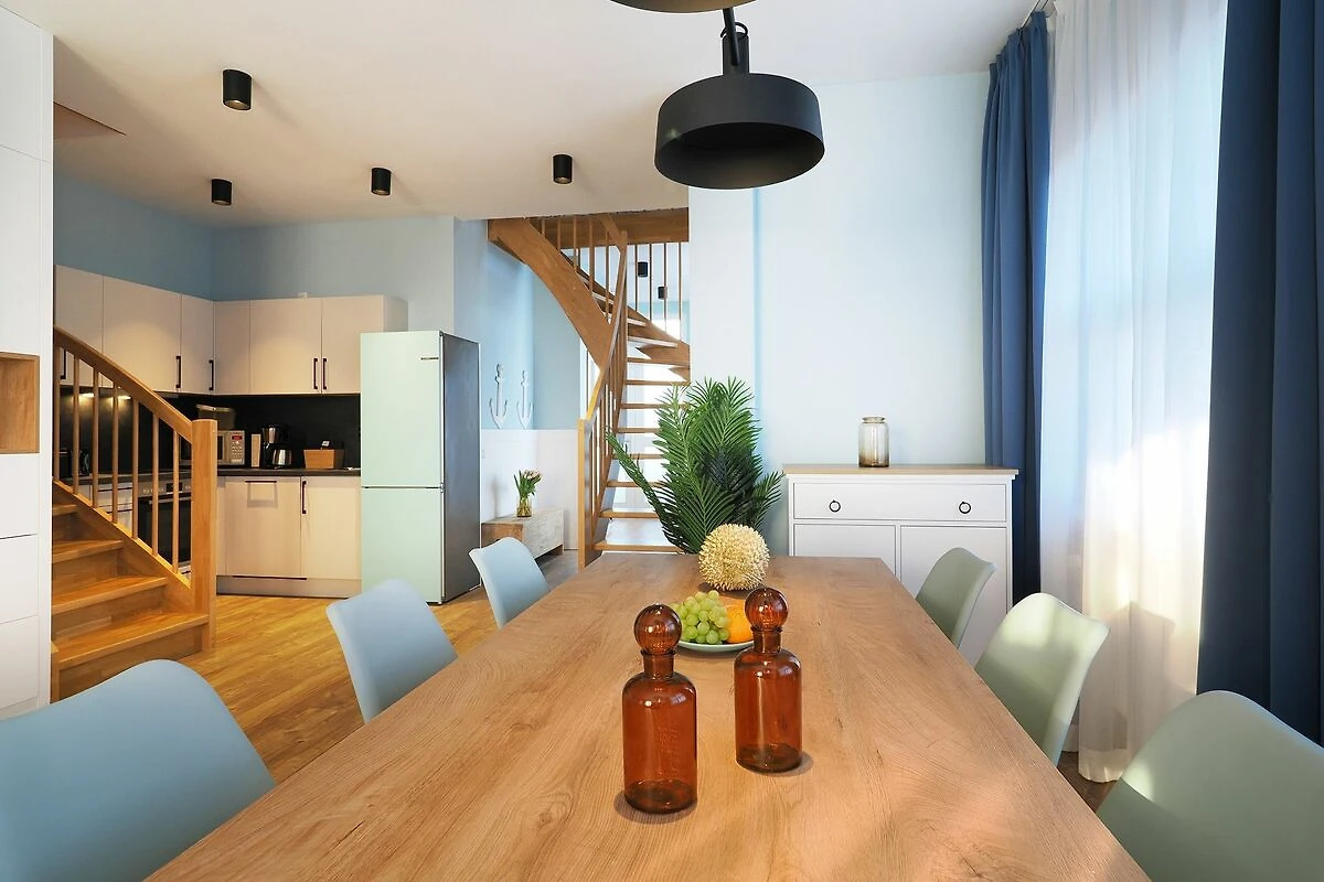 Entspannen Sie auf der Seebrücke Heringsdorf! Die 2023 renovierte, lichtdurchflutete 3-Raum Ferienwohnung ist auf zwei Ebenen konzipiert. Beide Schlafzimmer liegen auf der oberen Empore und sind vom darunter liegenden Wohnbereich aus über eine Wendeltreppe zu erreichen. In jedem der beiden Schlafzimmer sorgt ein Doppelboxspringbett für erholsamen Schlaf. Das Turmschlafzimmer hat neben dem Smart TV auch einen direkten Ausgang zum Balkon, wo Sie den herrlichen Weitblick auf die Ostsee haben. Im Wohnzimmer finden Sie genügend Einbauschränke für Ihre Garderobe und die bequeme Eckschlafcouch sorgt für kuschelige Gemütlichkeit. Über den Smart-TV können Sie am Abend die Fotos des Tages betrachten oder Ihre Lieblingsmusik hören. Der sich dem Wohnbereich unmittelbar anschließende, offene Küchenbereich mit dem großzügigen Essplatz ist mit Ceranfeld, Backofen, Geschirrspüler, Kühl-Gefrierkombination, Spülmaschine, Toaster, Mikrowelle, Wasserkocher und alle erforderliche Küchenutensilien ausgestattet. Das Badezimmer überzeugt mit einer ebenerdigen Dusche, einem Waschbecken und WC sowie einem großen Spiegel mit Kosmetikspiegel. Für Ihren Komfort sind Bettwäsche, Handtücher, Reinigungs- und Waschmittel als Erstausstattung inklusive. Vom Wohnbereich haben einen direkten Ausgang auf die Terrasse mit Sitzgarnitur, wo Sie den Sonnenaufgang genießen können. Der WLAN-Zugang ist kostenfrei nutzbar. Auf Wunsch stellen wir ein Kinderreisebett und einen Kinderhochstuhl gegen einen Aufpreis zur Verfügung. Vor dem Haus gibt es nur Be- und Endladeparkplätze, als Alternative bieten wir für das örtliche Parkhaus in Heringsdorf ermäßigte Parkkarten gemäß aktueller Preise. Die Parkkarte erhalten Sie bei Anreise in unserem Servicebüro. Haustiere sind in dieser Ferienwohnung herzlich willkommen, hierfür berechnen wir Gebühr gemäß aktueller Preise. Im Untergeschoss der Seebrücke steht Ihnen ein abschließbarer Fahrradraum sowie ein kleiner Waschraum mit Waschmaschine, Trockner, Bügelbrett und Bügeleisen kostenfrei zur Verfügung.