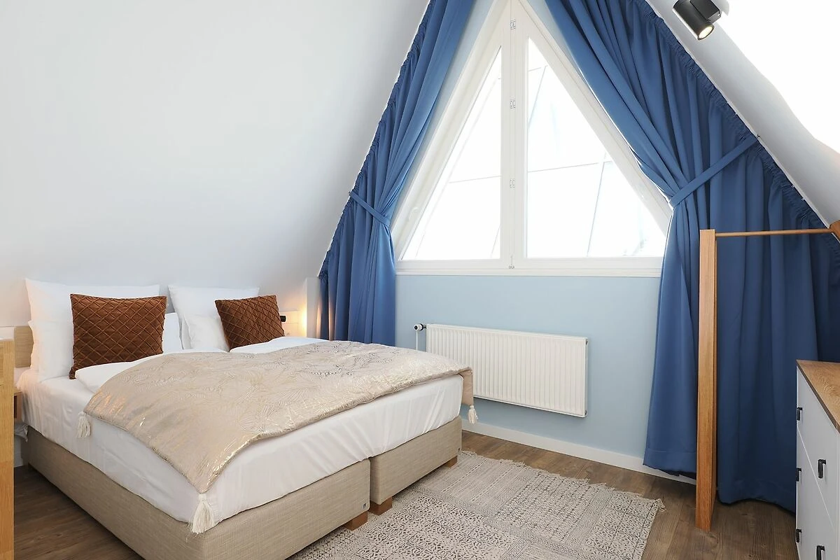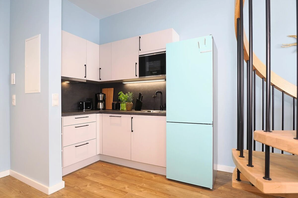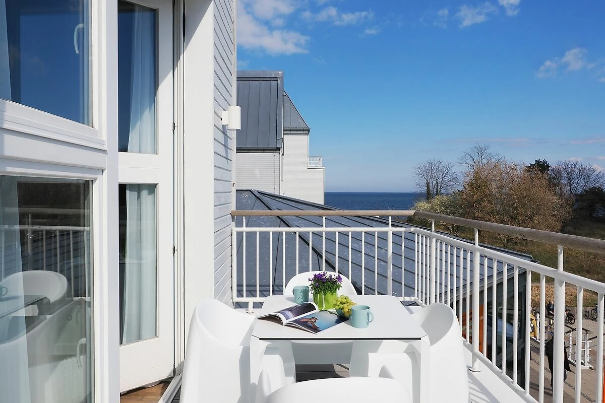 Entspannen Sie auf Ihrem privaten Balkon auf der Seebrücke Heringsdorf! Die 2023 renovierte, lichtdurchflutete Ferienwohnung ist auf zwei Ebenen, mit einer Empore auf der oberen Etage konzipiert und vom darunter liegenden Wohnbereich aus über eine Treppe zu betreten. Sowohl der separate Schlafbereich auf der Empore mit dem Boxspringdoppelbett, als auch das gemütliche Eckschlafsofa im Wohnzimmer mit Smart-TV bieten Ihnen angenehme Nächte. Neben dem komfortablen Esstisch im Wohnbereich finden Sie auch genügend Platz für Ihre Garderobe und haben einen direkten Ausgang zum Balkon mit Sitzgarnitur, wo Sie den herrlichen Weitblick auf die Ostsee genießen können. Die offene Küchenzeile im Wohnraum ist mit Ceranfeld, Geschirrspüler, Kühl-Gefrierkombination, Spülmaschine, Toaster, Mikrowelle, Wasserkocher und alle erforderliche Küchenutensilien ausgestattet. Das Badezimmer überzeugt mit einer ebenerdigen Dusche, einem Waschbecken, einem WC sowie einem großen Spiegel mit Kosmetikspiegel. Für Ihren Komfort sind Bettwäsche, Handtücher, Reinigungs- und Waschmittel als Erstausstattung inklusive. Der WLAN-Zugang ist kostenfrei nutzbar. Auf Wunsch stellen wir ein Kinderreisebett und einen Kinderhochstuhl gegen einen Aufpreis zur Verfügung. Vor dem Haus gibt es nur Be-und Endladeparkplätze, als Alternative bieten wir für das örtliche Parkhaus in Heringsdorf ermäßigte Parkkarten gemäß aktueller Preise. Die Parkkarte erhalten Sie bei Anreise in unserem Servicebüro. Haustiere sind in dieser Ferienwohnung herzlich willkommen, hierfür berechnen wir Gebühr gemäß aktueller Preise. Im Untergeschoss der Seebrücke steht Ihnen ein abschließbarer Fahrradraum sowie ein kleiner Waschraum mit Waschmaschine, Trockner, Bügelbrett und Bügeleisen kostenfrei zur Verfügung.