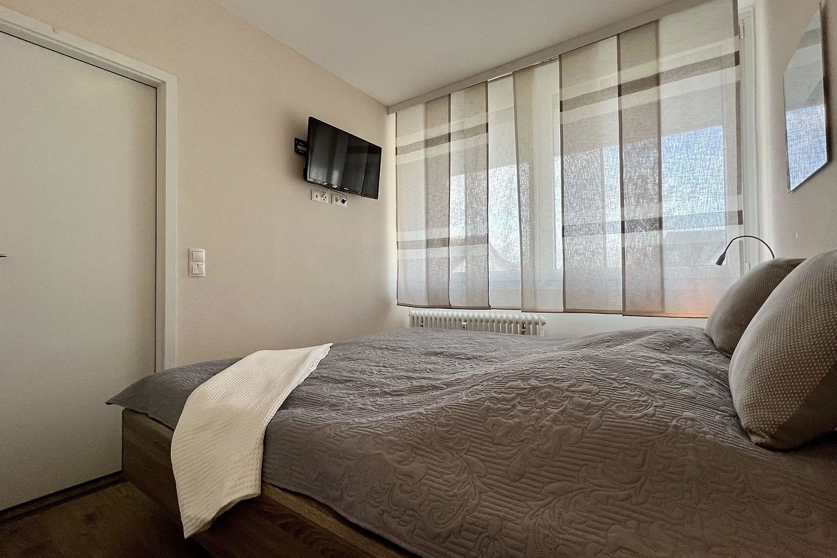 Das Schlafzimmer verfügt über ein Doppelbett und einen Kleiderschrank in dem Sie das Reisegepäck gut verstauen können. Verdunkeln lässt sich das Schlafzimmer mit einem Aussenrollladen. WLAN gehört selbstverständlich dazu.