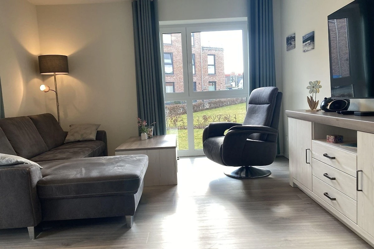 - modernes geschmackvoll eingerichtetes Wohnzimmer mit Sofa und Sessel, Flatscreen-Smart-TV im Wohnbereich, Musik über Radio/CD/Bluetooth