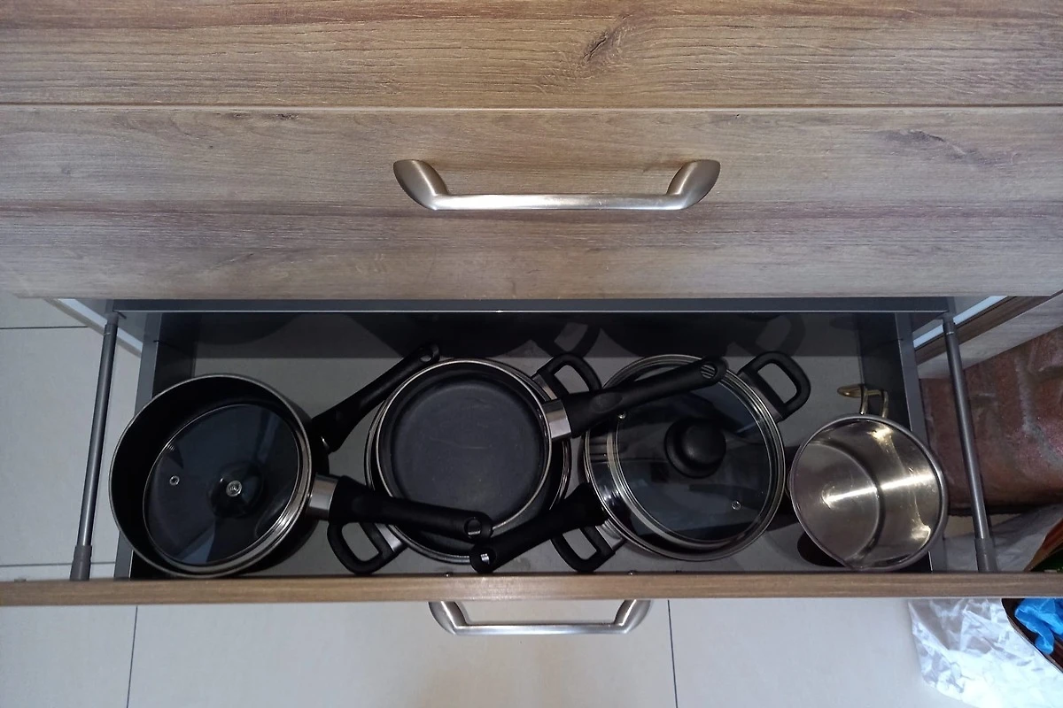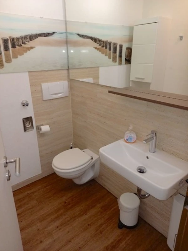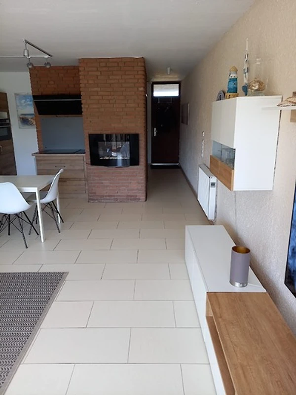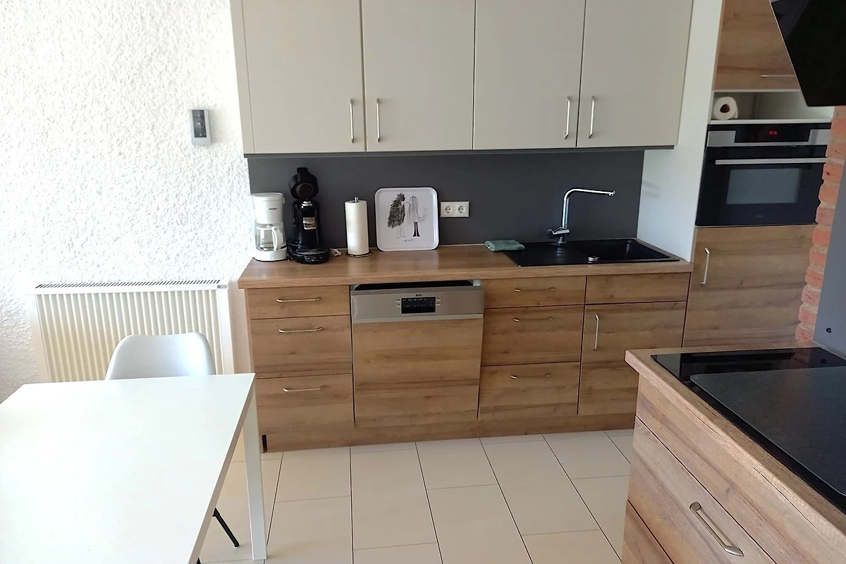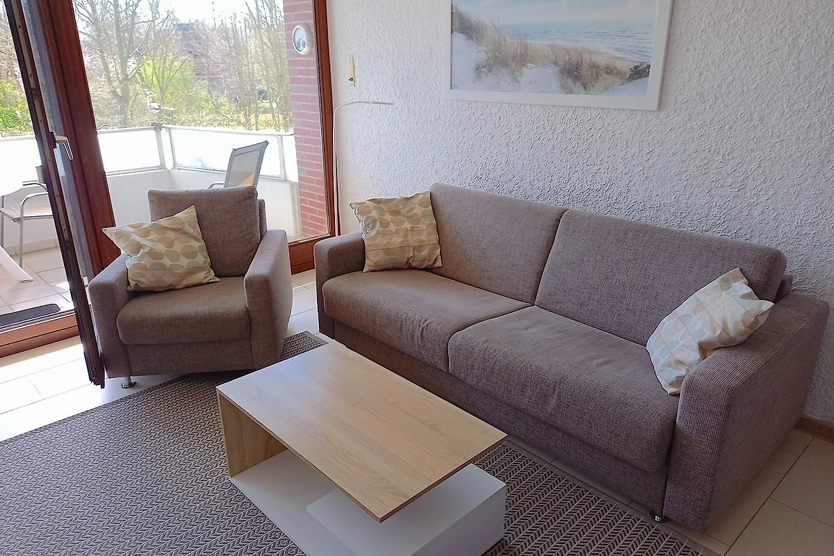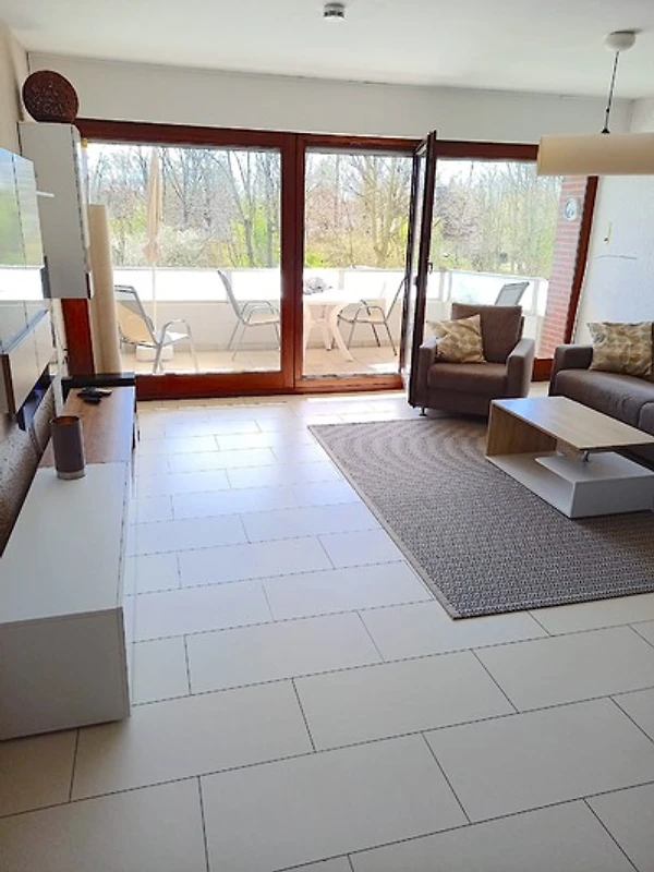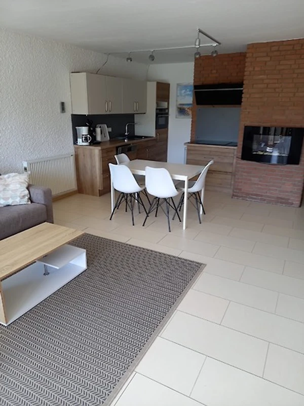 Das Apartment (52qm) bietet einen grosszügigen Wohnbereich mit Laminatfussboden in Fliesenoptik, eine offene Küche und eine Essecke. Auf einem Schlafsofa zum Aufklappen mit Lattenrost (140 x 200) im Wohnbereich finden bis 2 Personen gemütliche Nachtruhe. Bei schlechtem Wetter gibt es Fernsehen in HD, Bücher und Gesellschaftsspiele. Ein Notfall- u. Verbandskasten ist vorhanden.