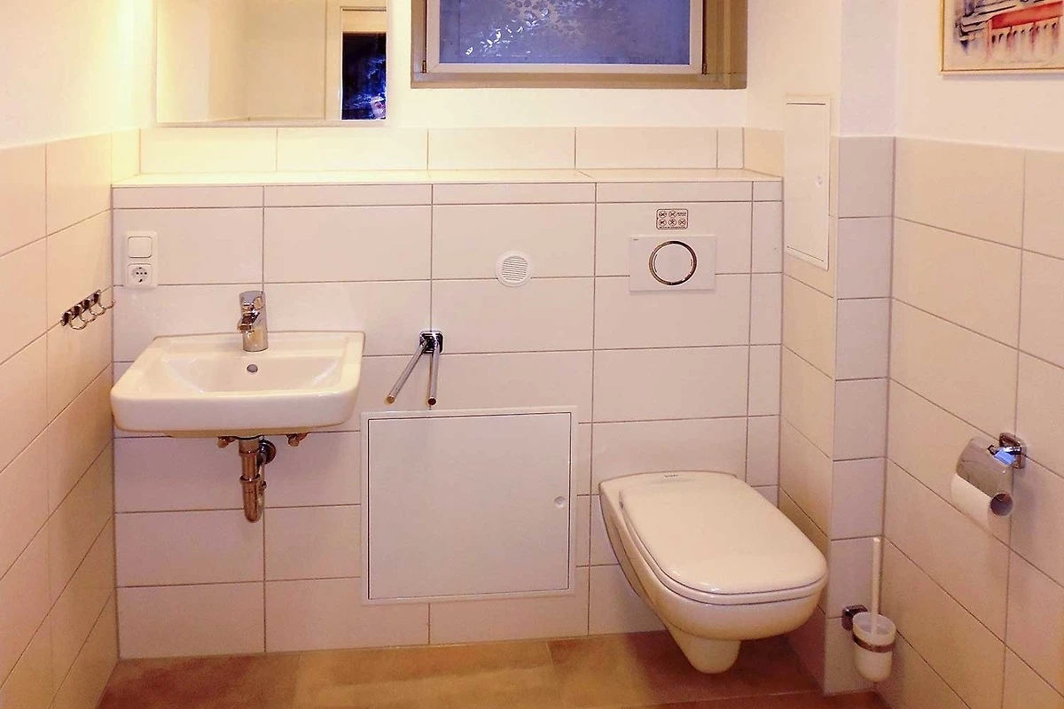 Zusätzliches Gäste-WC auf der 2. Ebene. Ein gemeinschaftlicher Hauswirtschaftsraum mit Waschmaschine, Trockner und Bügeleisen sowie Bügeltisch steht den Gästen zur Verfügung. Ein PKW-Stellplatz grenzt direkt ans Grundstück. Fahrradständer befinden sich vor dem Haus.