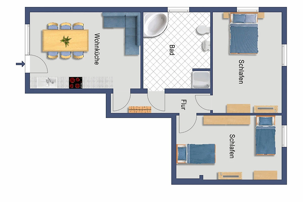 Die Fewo Eichenweg bietet mit 2 Schlafzimmern, Wohnküche und grossem Bad Platz für bis zu 4 Personen.