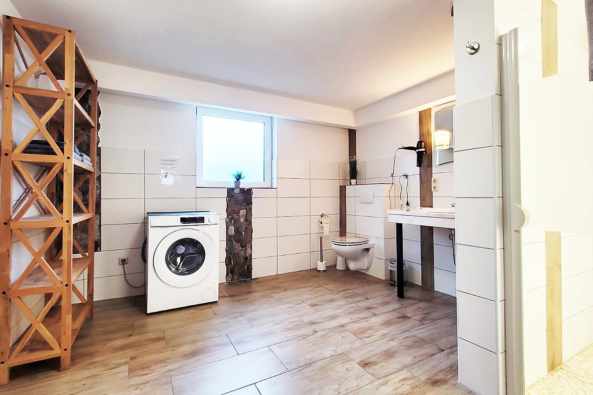 Das komfortable und geräumige Bad bietet eine grosse begehbare Dusche sowie eine Waschmaschine.