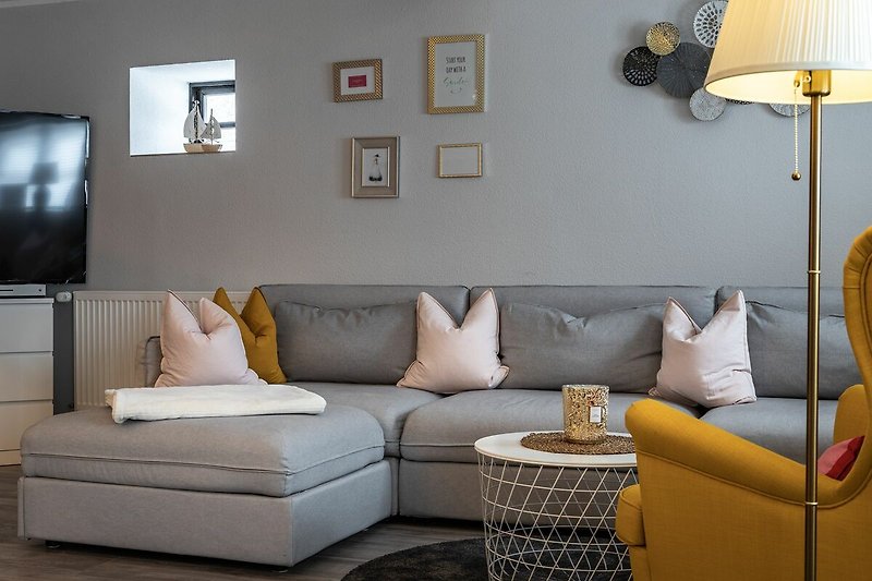 WOHNEN// großer heller Wohnraum mit bequemer Couch, Flachbild-TV (Kabel) und Essbereich ++