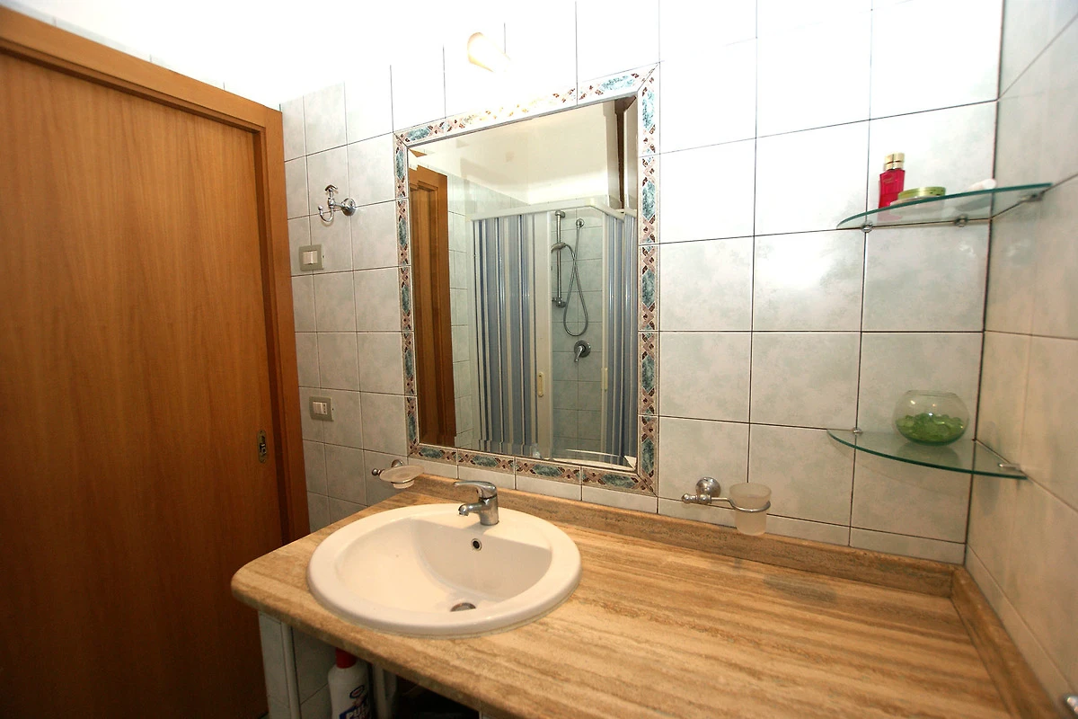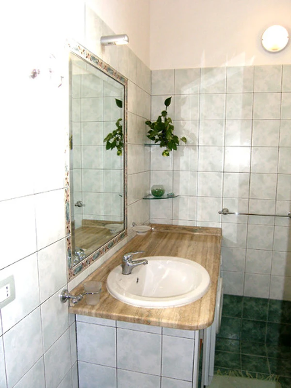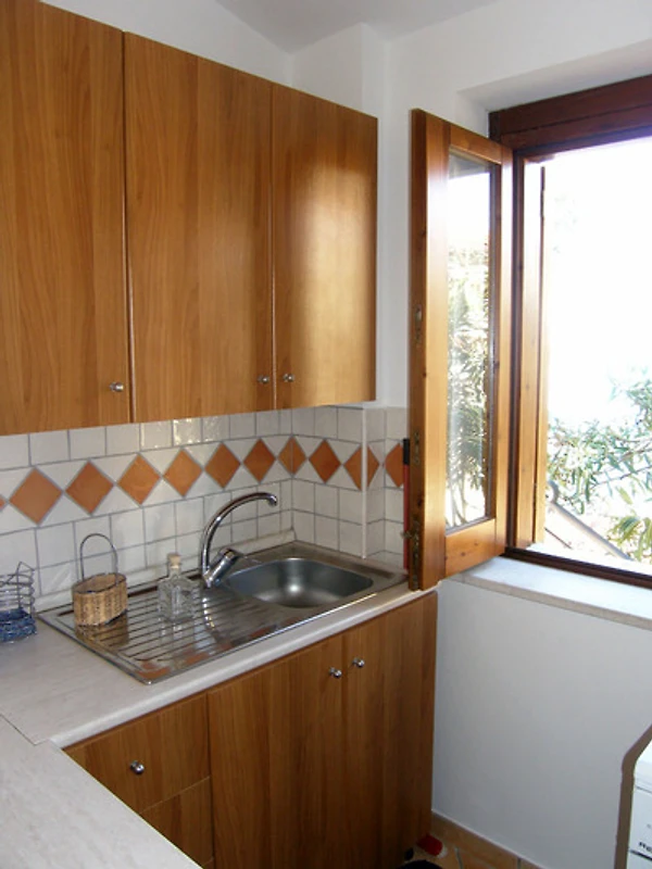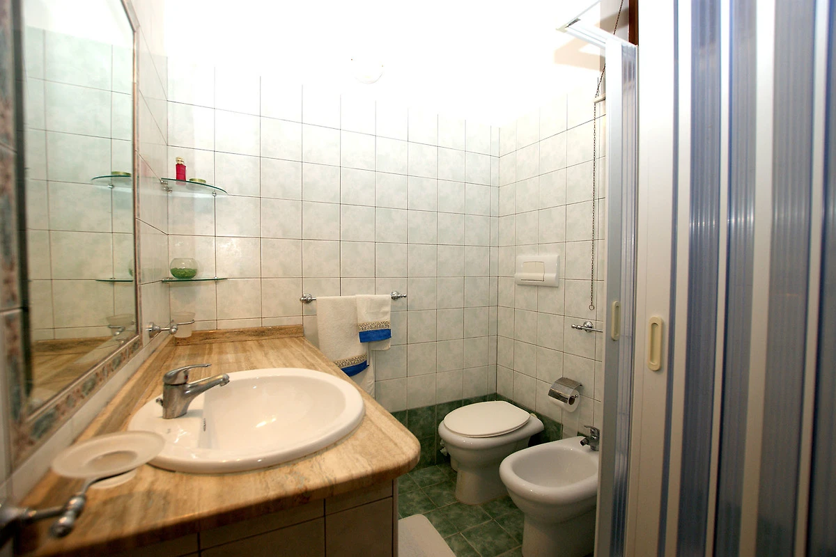 Villino Pagano has got an eat-in kitchen, which you enter the holiday home into and where you can do your cooking with a view of the sea, a bedroom with double bed, a small bedroom with bunk bed (3rd/4th pers.; suitable for children) and a windowed bathroom (shower/WC/bidet).