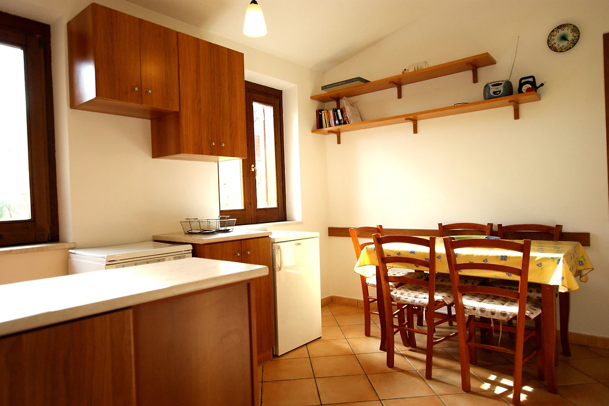 Sie betreten Villino Pagano über die mit Holzmöbeln eingerichtete Essküche, von der Sie während des Kochens direkt auf das Meer blicken können. An den Essbereich schliessen sich ein Schlafzimmer mit Doppelbett sowie ein weiteres, kleines Schlafzimmer mit Stockbett (3. / 4. Person, für Kinder geeignet) an. Im Tageslicht-Bad finden Sie u.a. eine Waschmaschine vor.