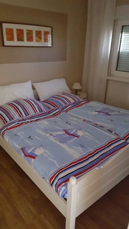 Im Schlafzimmer finden Sie ein (1,6*1,90 m Matratze, Neu Dez.2021) Doppelbett. Der Schlafraum hat Aussenrolladen zum Verdunkeln. Im Wohnzimmer befindet sich eine 1,60 m x 2,00 m ( Querschläfer)) breite Ausziehcouch..