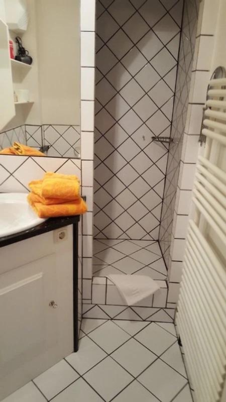 Das Badezimmer(Dusche) hat einen Fliesenfussboden.