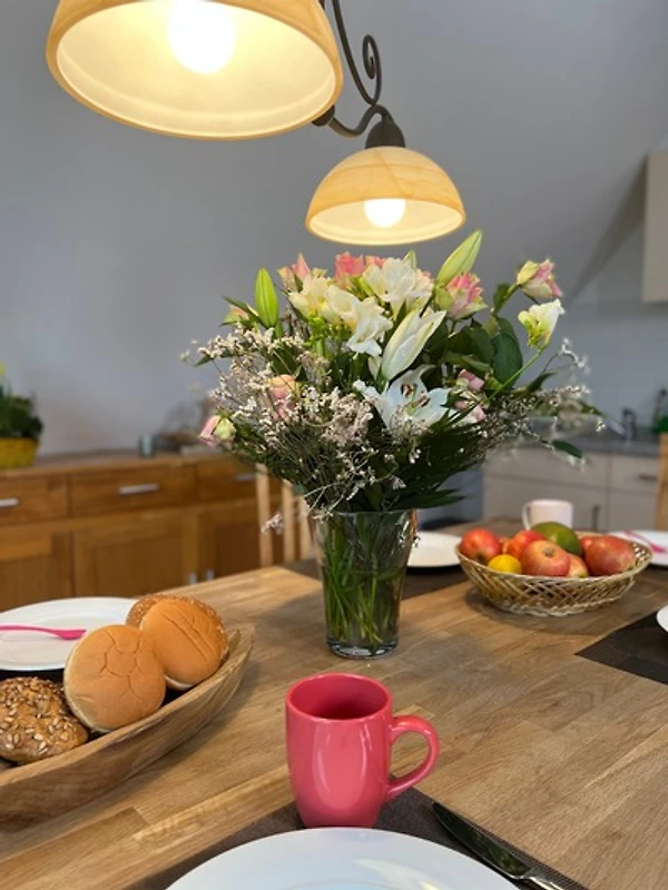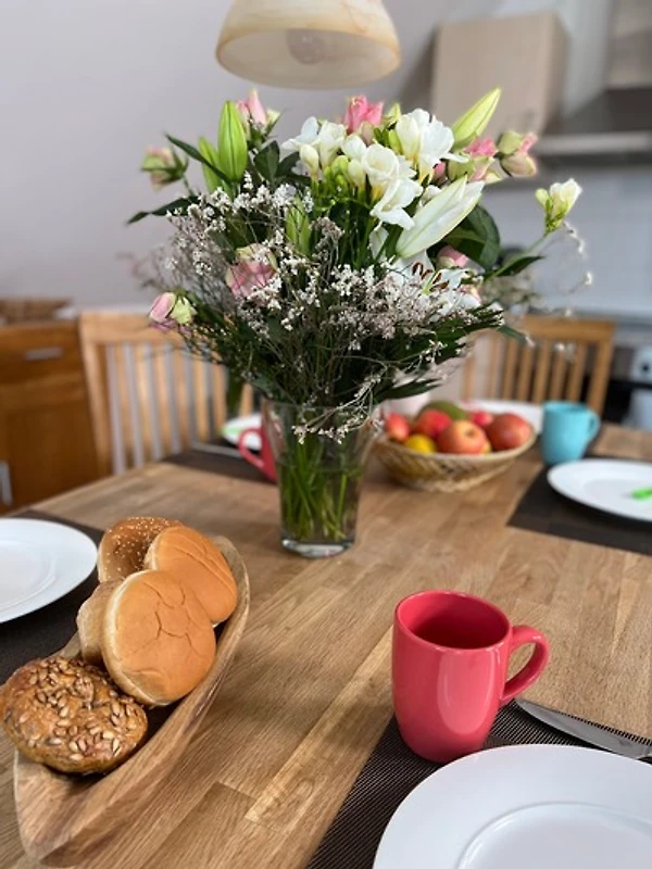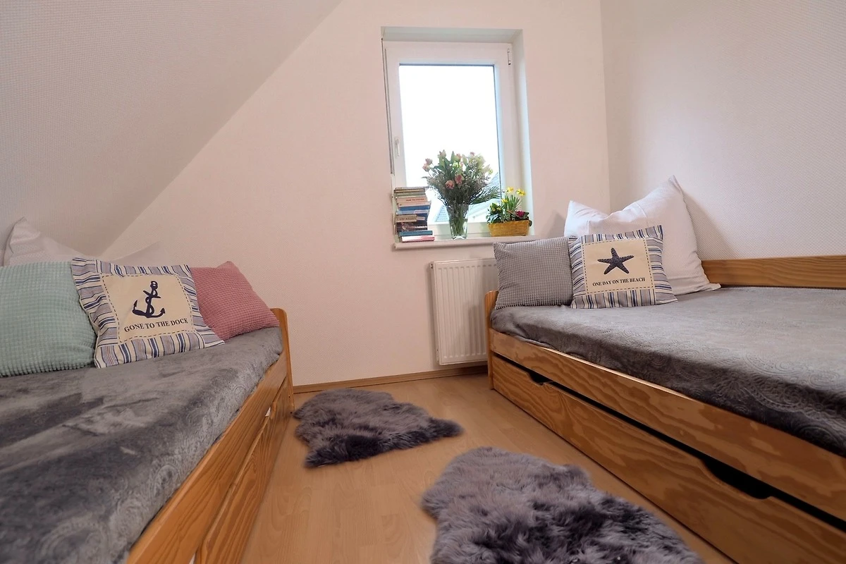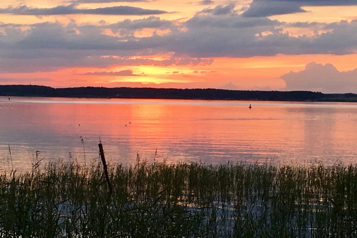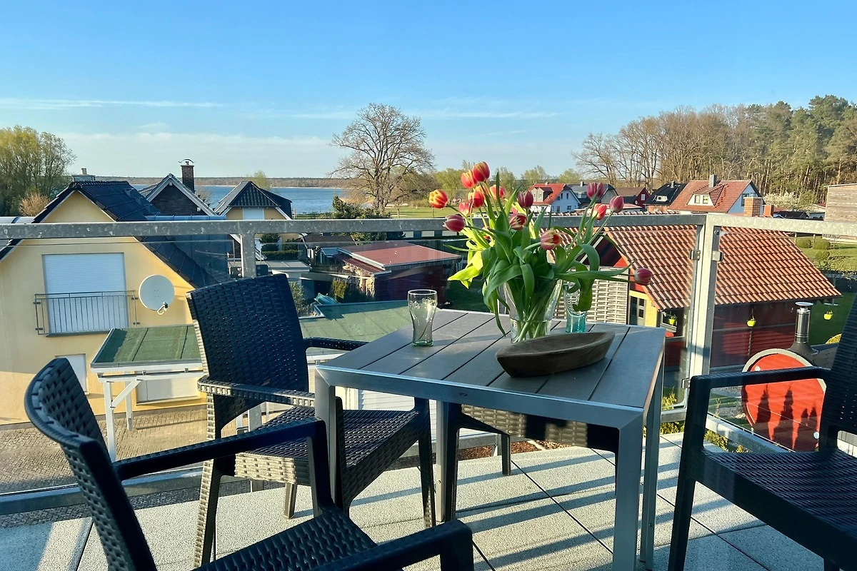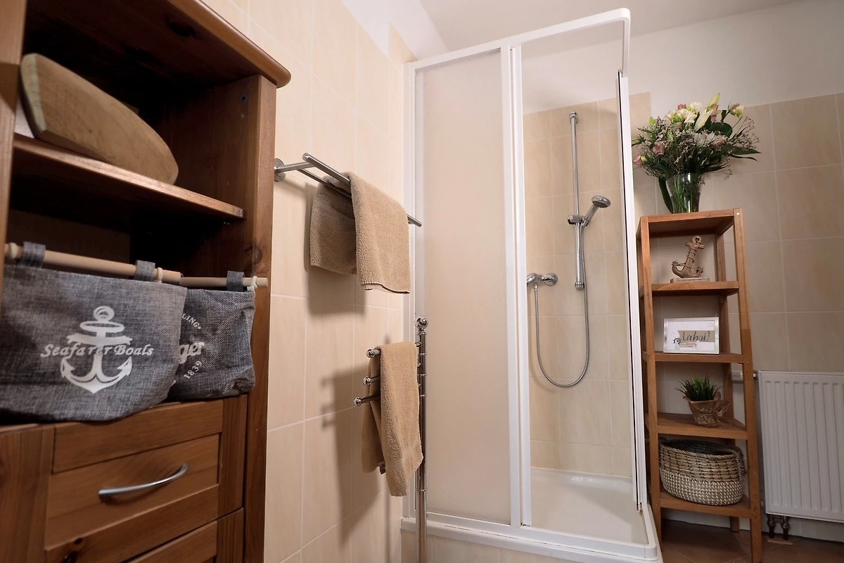 Du betrittst das Objekt über den Hauseingang und gehst durch den Hausflur auf die erste Etage. Wenn du die Ferienwohnung Kapitäns – Seeblick betrittst, kannst du von dem grosszügigen Flur sternförmig alle Räume entdecken. Das Tageslicht Duschbad, die zwei gemütlichen Schlafzimmer und nicht zuletzt den grossen Wohn – und Essbereich mit offener Küche. Von dort aus gelangst du auf den schönen Balkon der mit modernen Terrassenmöbel möbliert ist und geniesst den Blick auf den See.