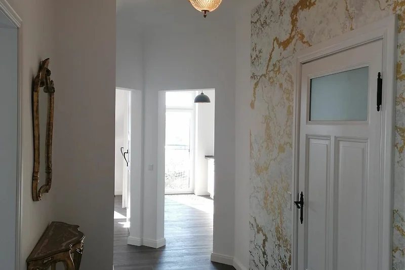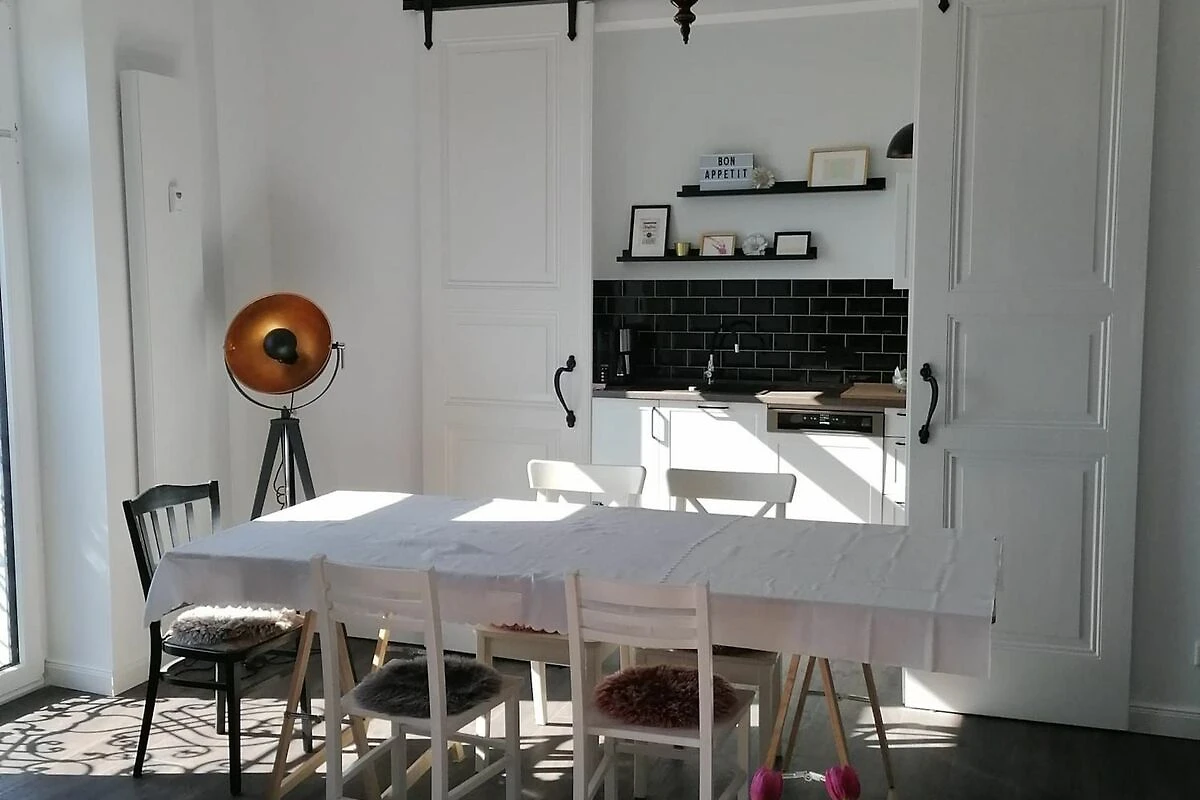 Die modern eingerichtete Ferienwohnung befindet sich im 1. OG eines Mehrfamilienhauses, welches z. T. vermietet ist. Der anliegende Garten ist von der Nutzung ausgenommen. Die Ferienwohnung ist 84m² gross sowie voll ausgestattet und verfügt über eine offene Küche, die auch abgetrennt werden kann (Schiebetür). Das gemütliche Wohnzimmer ist mit einem Kamin und Flachbildschirm ausgestattet, wobei noch das Lesezimmer zu erwähnen ist. Vom Wohnzimmer aus hat man einen traumhaften Blick auf den Malchower See, sowie die Malchower Insel. Das Schlafzimmer verfügt über ein Doppelbett (180 cm x 200 cm), Schrank und Sitzmöglichkeiten. Wäschepaket ist inklusive. Alle Räume sind mit elektrischen Rollos ausgestattet und verfügen über WLAN. Parkmöglichkeiten befinden sich vor der Tür, können jedoch nicht reserviert werden. Ihre Fahrräder können Sie vor dem Haus im Fahrradständer abstellen. Ein kleiner Balkon, der über den Hausflur zu erreichen ist, runden das Bild der modernen Wohnung ab. Gleich neben der Unterkunft befindet sich ein öffentlicher Zugang zur Wasserstrasse mit einer Bank zum Verweilen. Ein Spielplatz (0,9 km entfernt) sowie Bootsverleih (0,9 km entfernt) finden Sie im Ort. Die Wohnung ist nach Qualitätskriterien der DTV- Klassifizierung mit 5 Sternen ausgezeichnet.