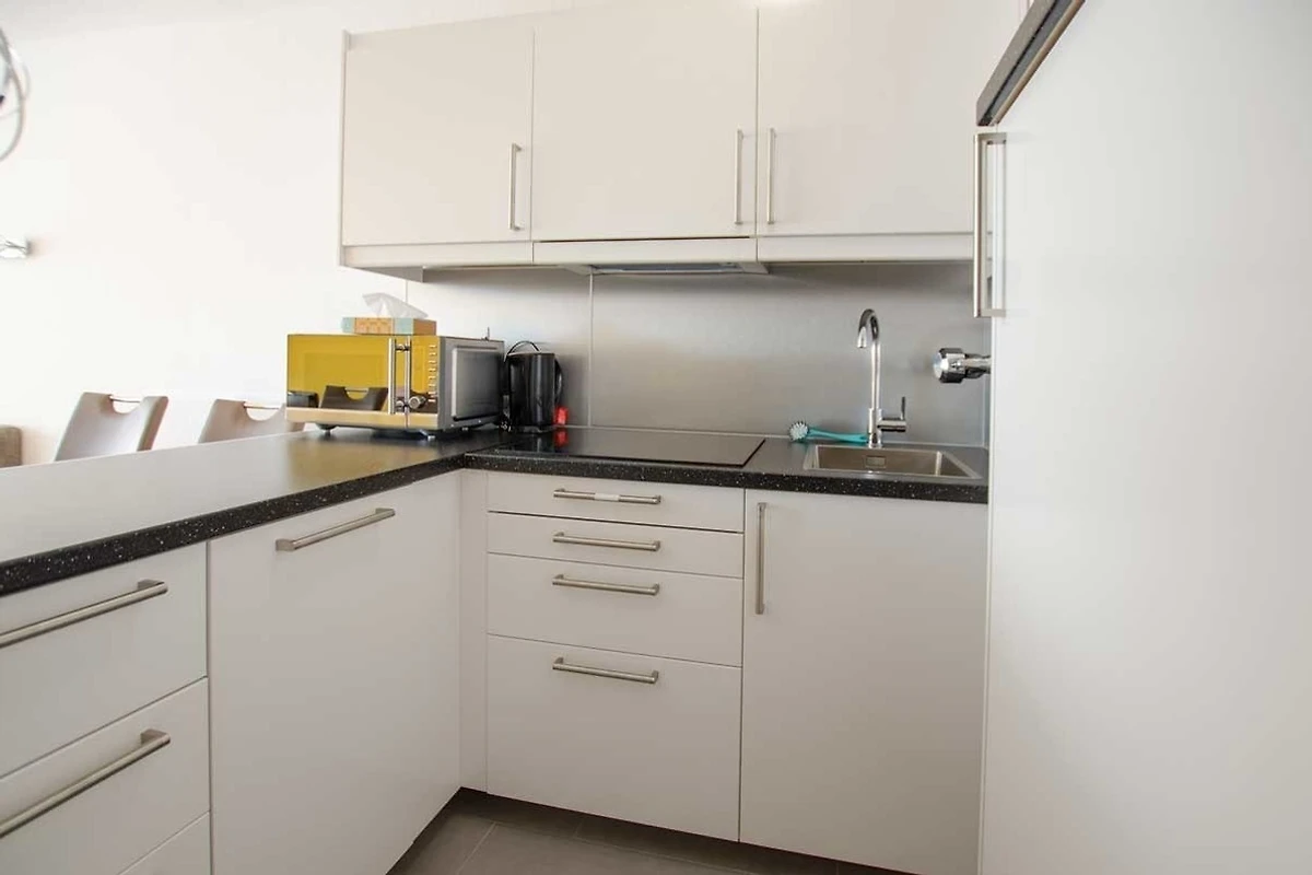 Die moderne Küche mit Kühlschrank, Geschirrspüler, Kombinations-Mikrowelle und Cerankochfeld hochwertig ausgestattete Küche hat eine Durchreiche zum Wohnbereich.