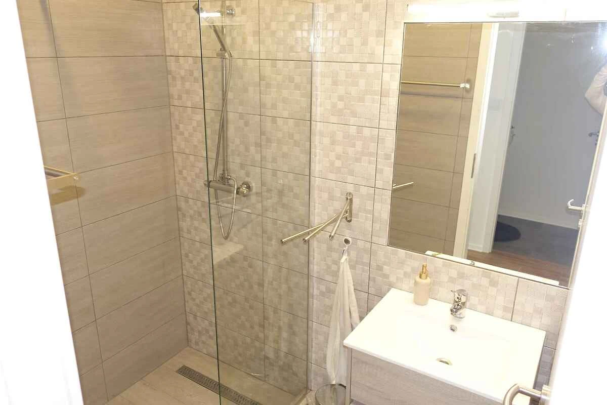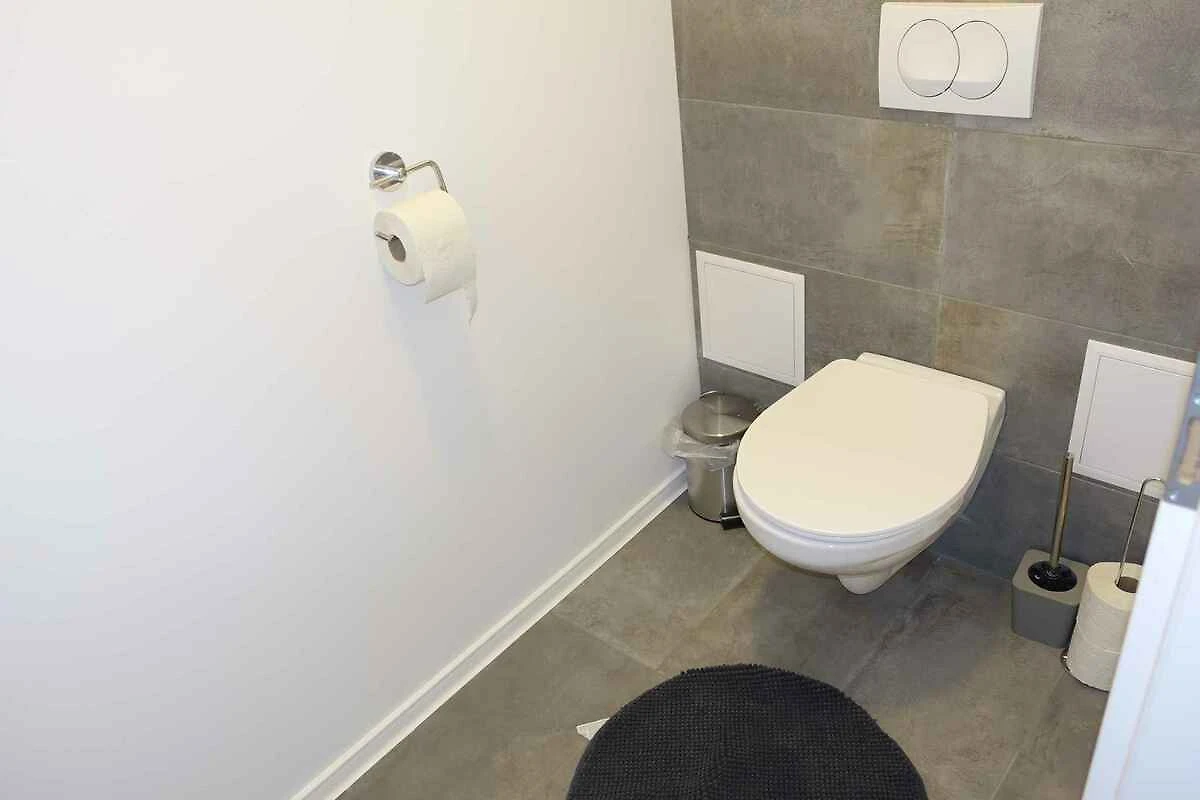 Erdgeschoss: Wohnzimmer (30 qm) mit Sitzecke, TV und Essecke (6 Plätze). Schlafzimmer (13 qm) mit 1 Doppelbett, TV und Zugang zur Terrasse. Amerikanische Küche mit Elektroherd (Induktionsherd, Cerankochfeld, 2 Platten), Backofen, Kühlschrank (300 l, Eisfach), Mikrowelle, Kaffeemaschine, Toaster, elektrischem Wasserkocher, Waschmaschine und Zugang zur Terrasse (15 qm, überdacht, Gartenmöbel, 1 Tisch, 6 Stühle). Bad mit Dusche und 1 Waschbecken. Separates WC mit WC.