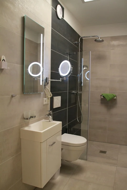 Direkt neben der Bad Tabarzer Kneipp-Kuranlage befindet sich in Baumkronenhöhe unsere hochwertig ausgestattete, klimatisierte Loft- Ferienwohnung mit einer Wohnfläche von 89 m² für 2 - 4 Personen. Autostellplätze unter dem Carport sind vorhanden. Mit einem Aufzug erreichen auch gehbehinderte Personen mühelos die Wohnung. Ein Schlafzimmer bietet Platz für 2 Erwachsene. Eine Aufbettung für 2 Personen sowie ein Kinderreisebett können bei Bedarf bereitgestellt werden. Zwei Bäder mit grosszügiger Beleuchtung und Kosmetikspiegel, eines mit Badewanne und eines mit Dusche sind vorhanden. Die Wohnung bietet ausserdem eine möblierte 112 m² grosse Dachterrasse mit Blick auf die Kneipp-Kuranlage und umliegende Wanderwege. Die hochwertige Küche ist mit Backofen, Tellerwärmer, Mikrowelle, Herd, Kühl-Gefrierkombi, Kaffeevollautomat, Wasserkocher, Toaster, Kochgeschirr, Essgeschirr, Besteck und mit Gläsern ausgestattet. Auf der gemütlichen Couch können Filme auf einem 66 Zoll TV-Gerät geschaut werden.