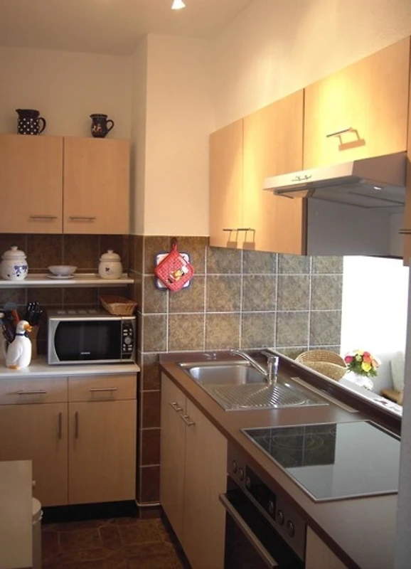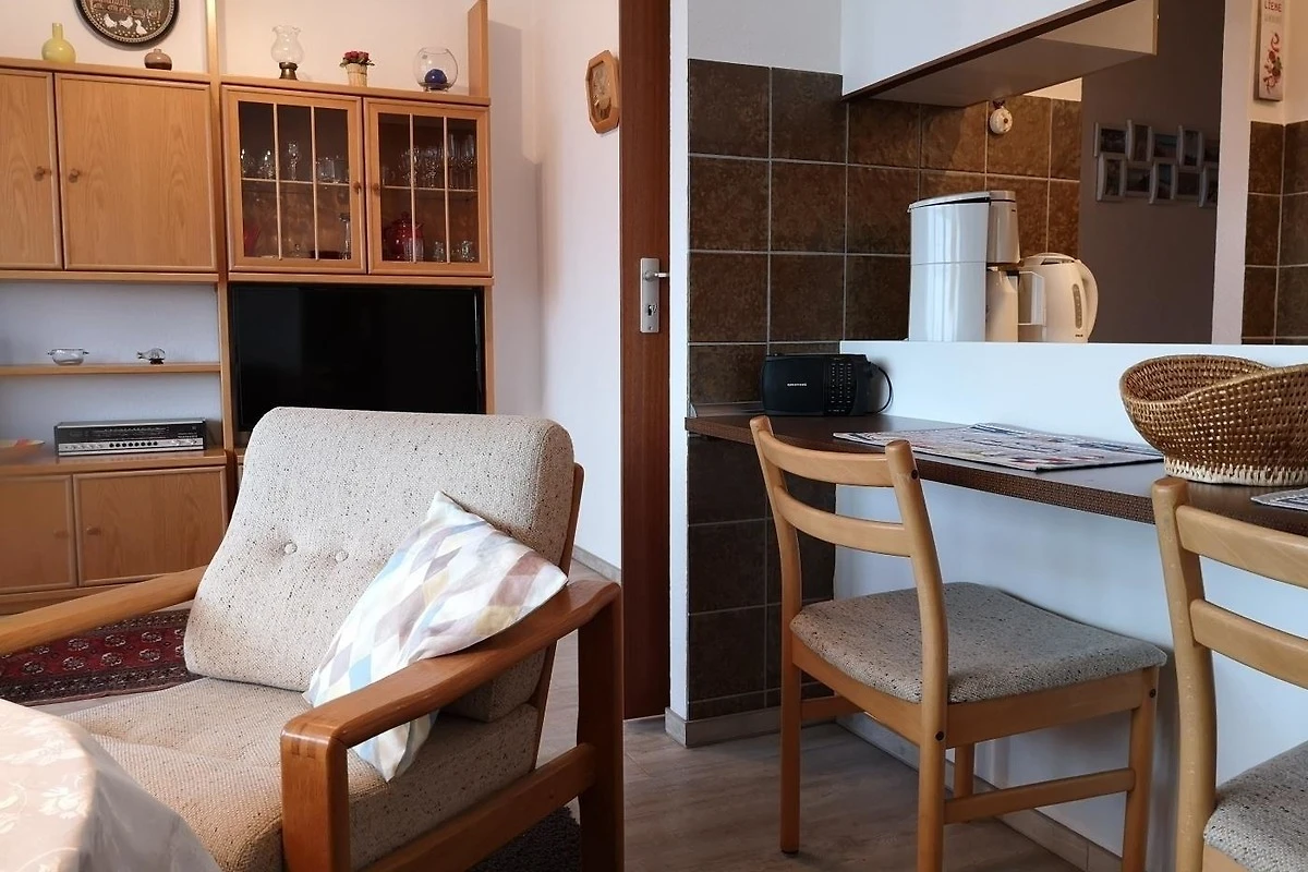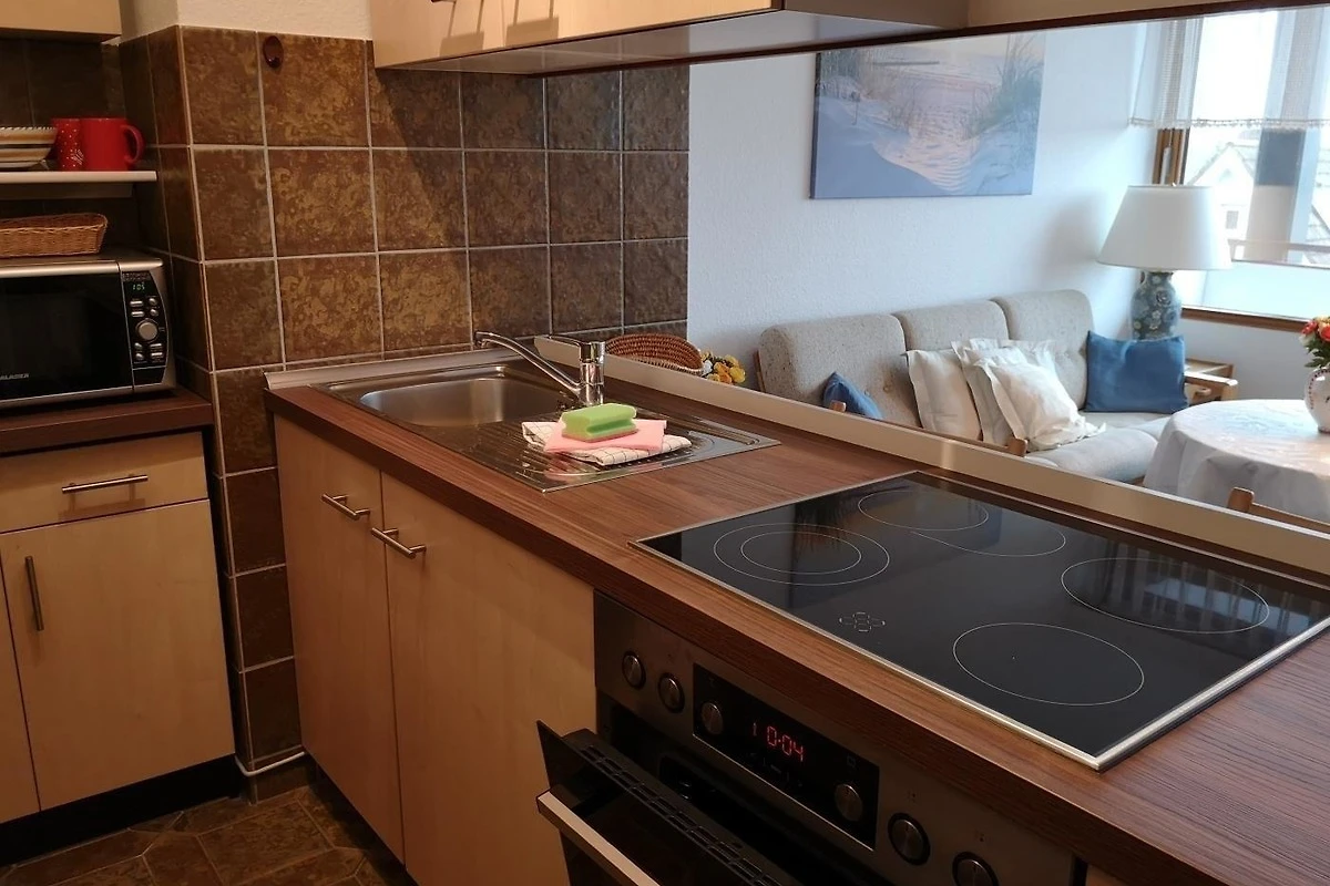 Dieses Ferienappartement besitzt einen Lift. Das Wohnzimmer der Ferienwohnung ist mit einem Farb-Sat-TV ausgestattet. Die Küche ist mit einem Frühstückstresen ausgestattet. Ausserdem befindet sich hier alles, was sie brauchen um auch im Urlaub jederzeit ihre Kochkünste unter Beweis stellen zu können. Das Schlafzimmer ist mit einem Doppelbett ausgestattet. Ausserdem befindet sich in der Wohnung ein Duschbad.
