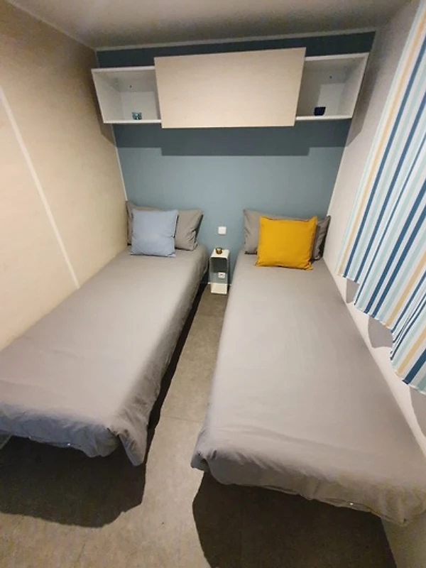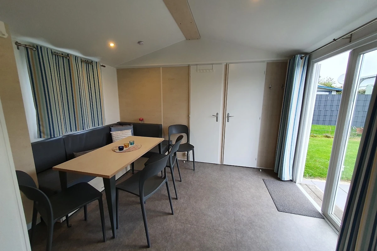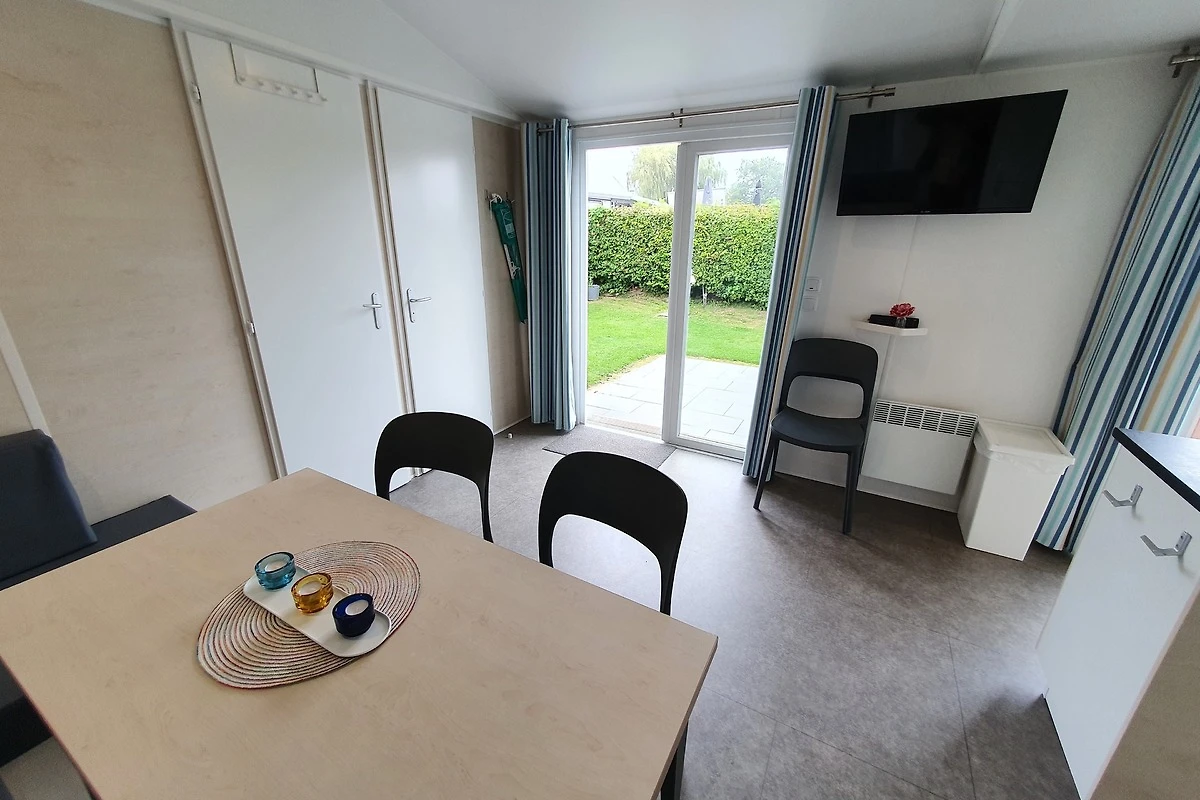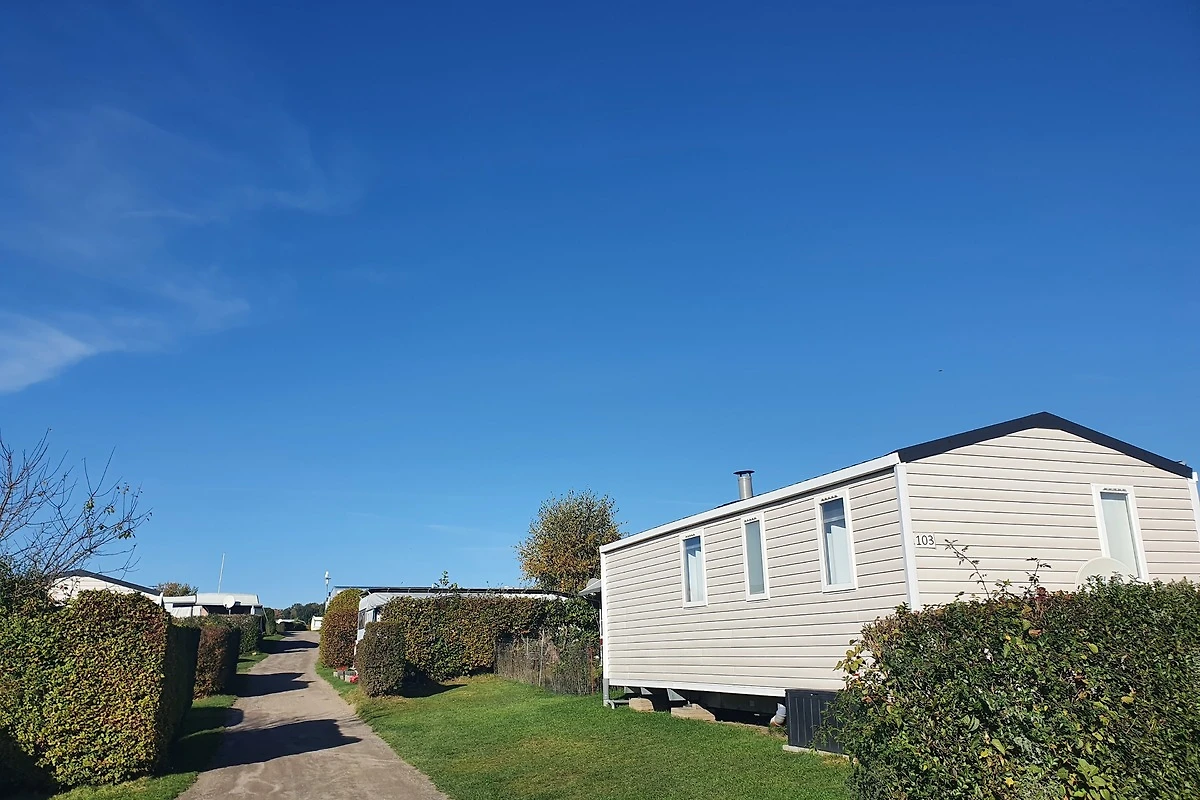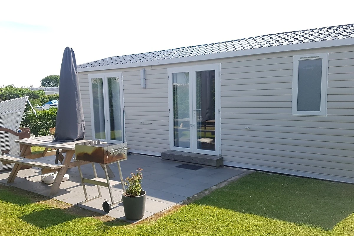 Unsere Mobilheime sind hell und modern ausgestattet und verfügen jeweils über einen kombinierten Wohn-/Essbereich mit integrierter Küchenzeile, 2-3 Schlafzimmern, 1-2 Bädern mit Dusche sowie 1-2 separaten WC. Eines der Bäder ist jeweils direkt von einem der Schlafzimmer aus zugänglich (en-suite). Auf der Terrasse stehen Ihnen ein eigener Strandkorb, ein Tisch mit Bänken und Sonnenschirm sowie ein Grill zur Verfügung. Ein kleiner Gartenbereich sorgt für weitere Entspannungsmöglichkeiten. Ihr Auto parken Sie direkt am Mobilheim.