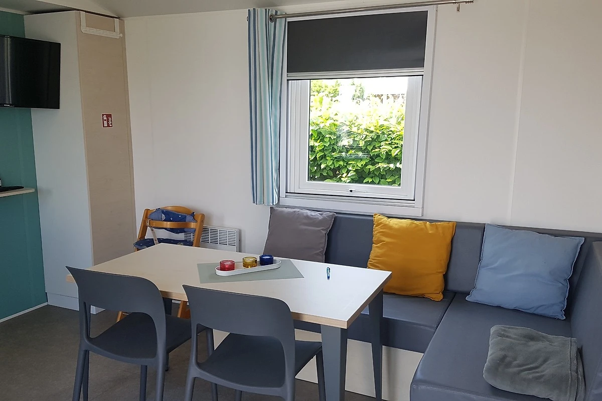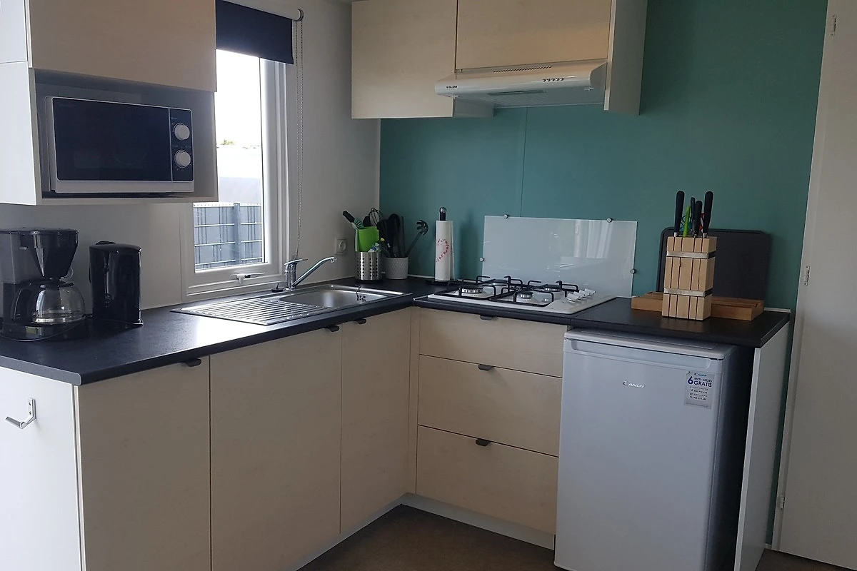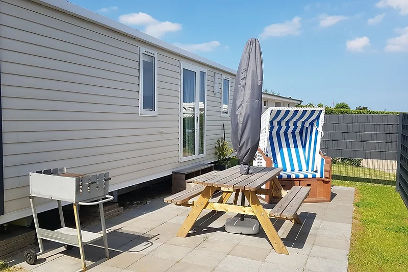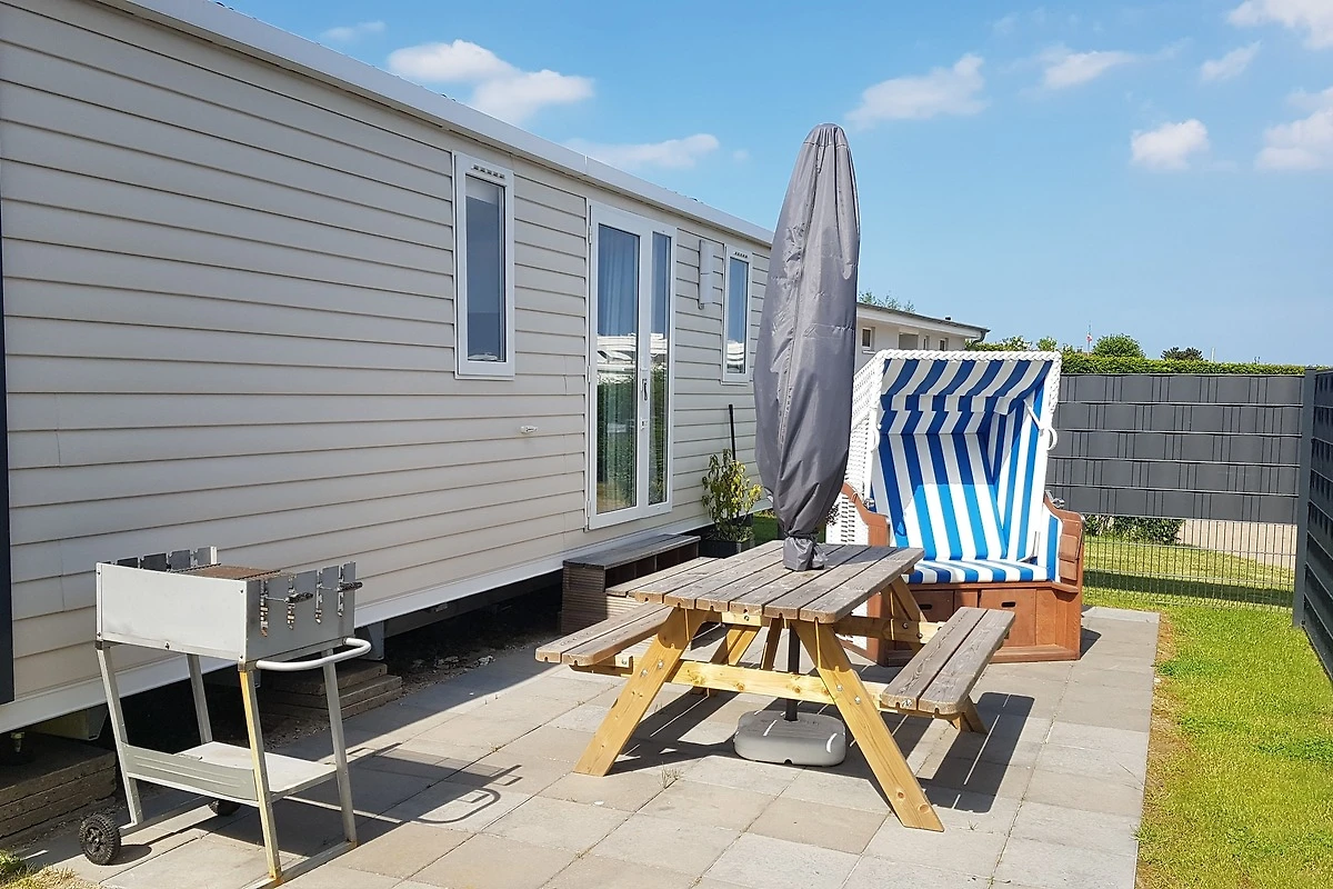 Unsere Mobilheime sind hell und modern ausgestattet und verfügen jeweils über einen kombinierten Wohn-/Essbereich mit integrierter Küchenzeile, 2-3 Schlafzimmern, 1-2 Bädern mit Dusche sowie 1-2 separaten WC. Eines der Bäder ist jeweils direkt von einem der Schlafzimmer aus zugänglich (en-suite). Auf der Terrasse stehen Ihnen ein eigener Strandkorb, ein Tisch mit Bänken und Sonnenschirm sowie ein Grill zur Verfügung. Ein kleiner Gartenbereich sorgt für weitere Entspannungsmöglichkeiten. Ihr Auto parken Sie direkt am Mobilheim.