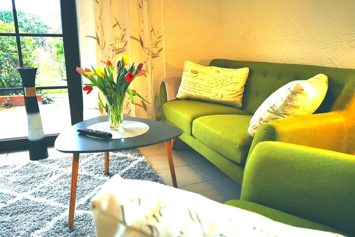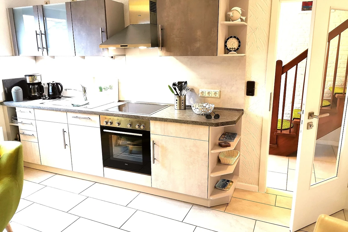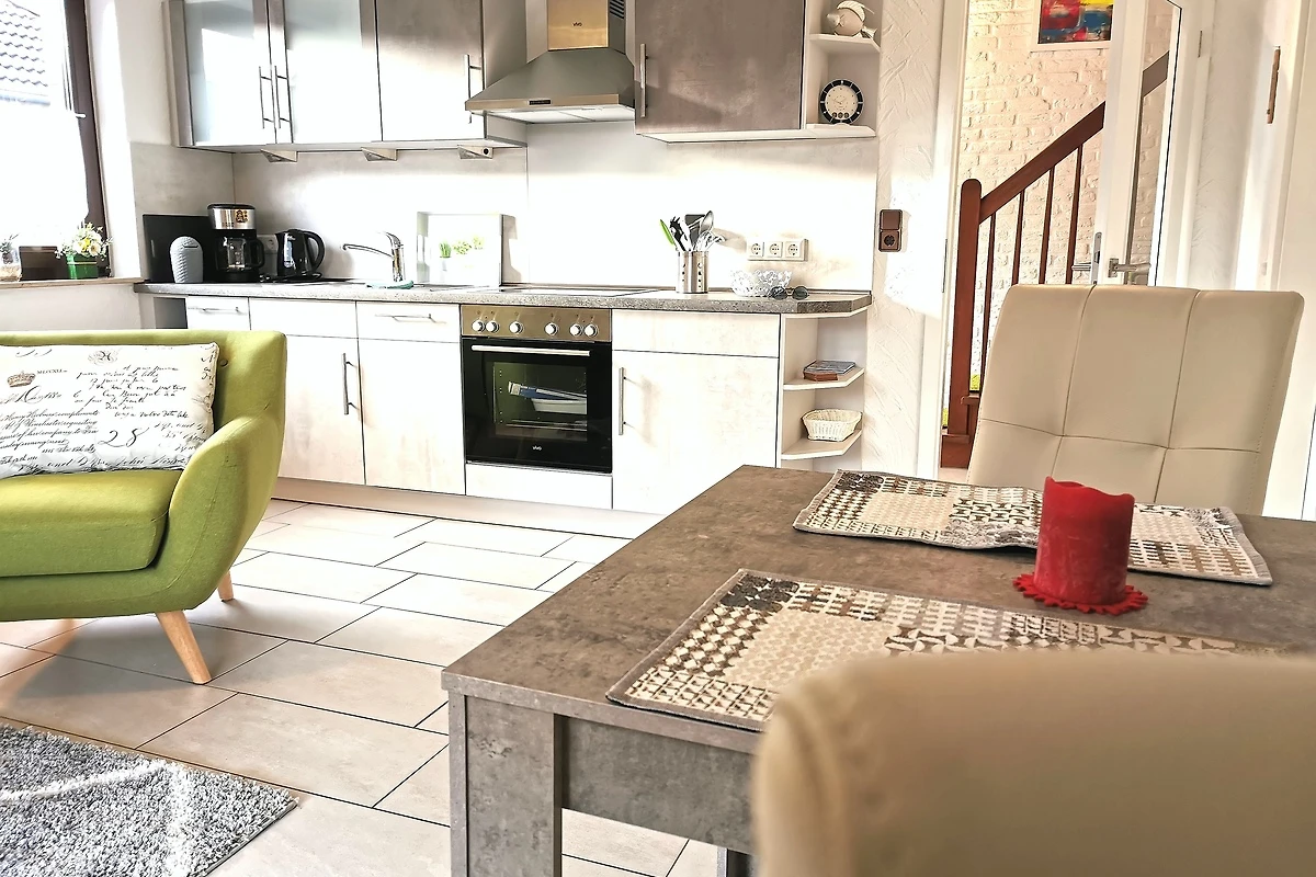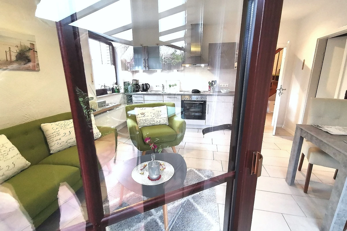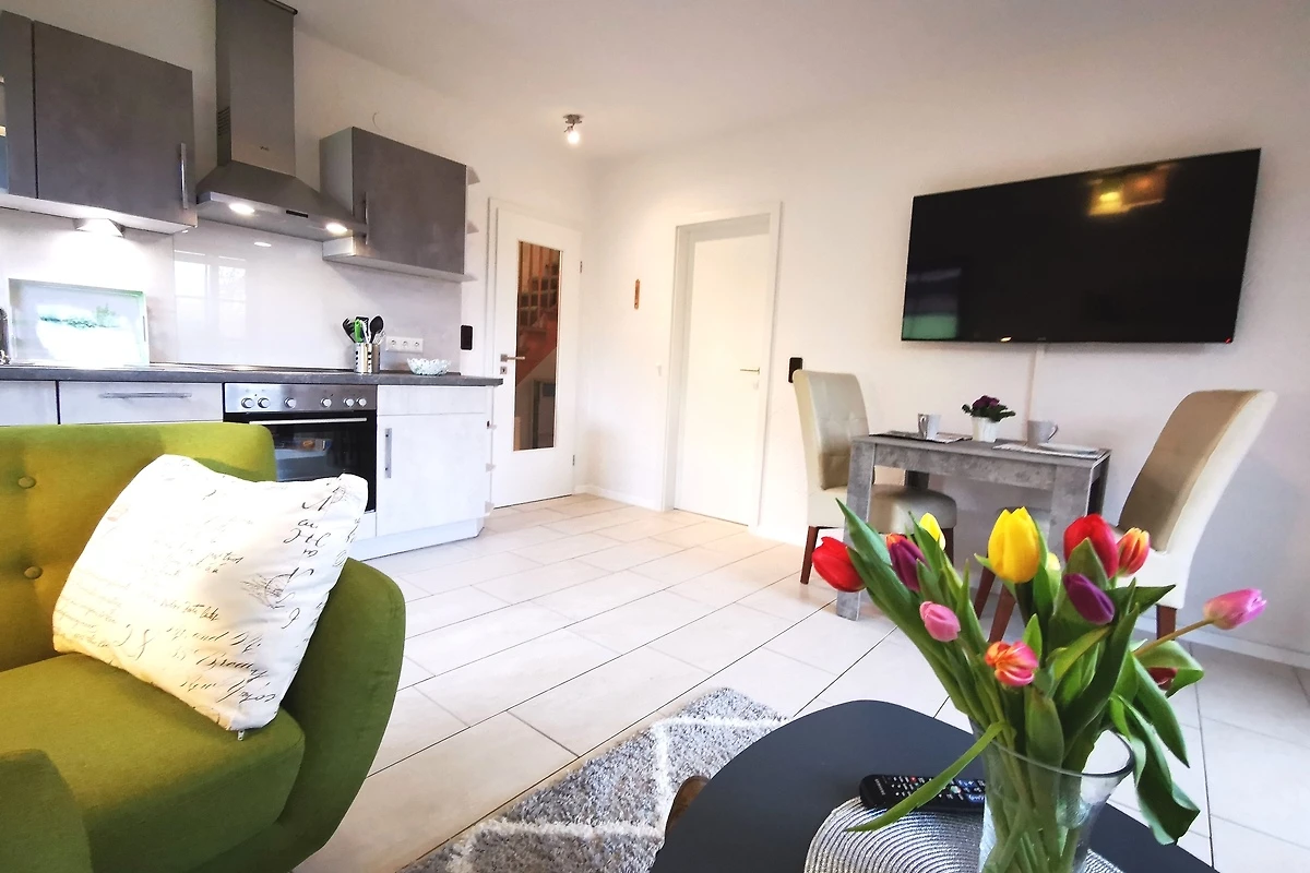 Exklusive Ferienwohnung mit eigener überdachten Terrasse in Süd-West-Lage und gehobener Ausstattung (Smart-TV, Geschirrspülmaschine, Gäste-WC etc.). Die Wohnung ist. 65 qm gross und befindet sich in einer absolut ruhigen Lage in einer Sackgasse. Eine Unterstellmöglichkeit für Fahrräder ist selbstverständlich vorhanden. Diese beinhaltet unter anderem auch eine Ladestation für E-Bikes. Die Ferienwohnung ist für max. 2 Personen buchbar und aufgeteilt wie ein Reihenhaus, in Ober- und Untergeschoss mit grosser überdachter Terrasse. Ein eigener grosser Parkplatz befindet sich direkt vorm Haus. WLAN ist selbstverständlich vorhanden und kostenfrei. Haustiere sind leider nicht mehr bei uns erlaubt. Die Bettwäsche und Handtücher sind im Mietpreis enthalten.
