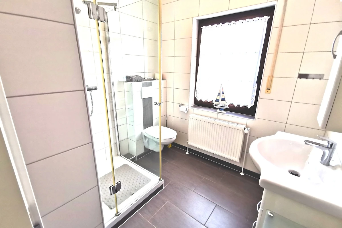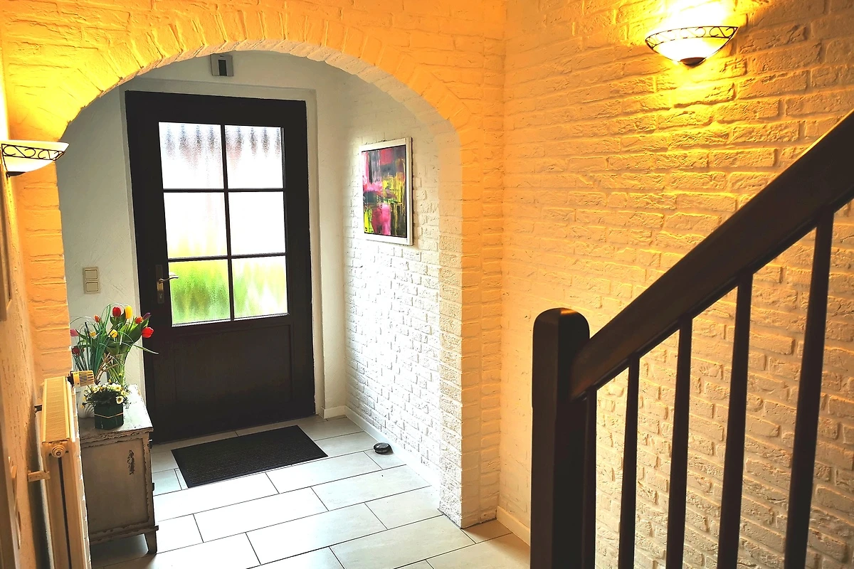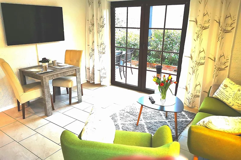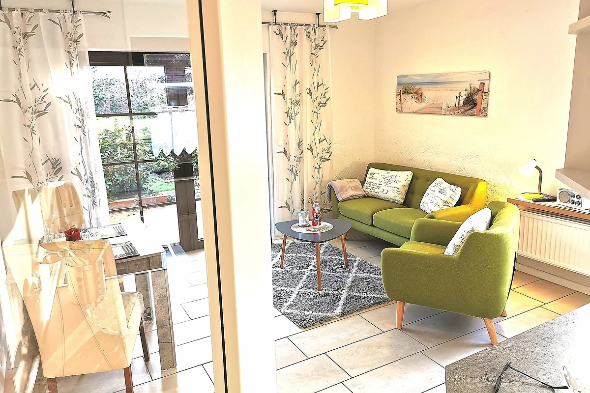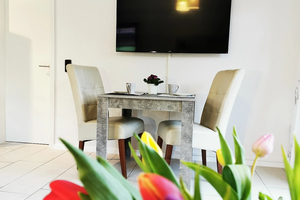 Exklusive Ferienwohnung mit eigener überdachten Terrasse in Süd-West-Lage und gehobener Ausstattung (Smart-TV, Geschirrspülmaschine, Gäste-WC etc.). Die Wohnung ist. 65 qm gross und befindet sich in einer absolut ruhigen Lage in einer Sackgasse. Eine Unterstellmöglichkeit für Fahrräder ist selbstverständlich vorhanden. Diese beinhaltet unter anderem auch eine Ladestation für E-Bikes. Die Ferienwohnung ist für max. 2 Personen buchbar und aufgeteilt wie ein Reihenhaus, in Ober- und Untergeschoss mit grosser überdachter Terrasse. Ein eigener grosser Parkplatz befindet sich direkt vorm Haus. WLAN ist selbstverständlich vorhanden und kostenfrei. Haustiere sind leider nicht mehr bei uns erlaubt. Die Bettwäsche und Handtücher sind im Mietpreis enthalten.